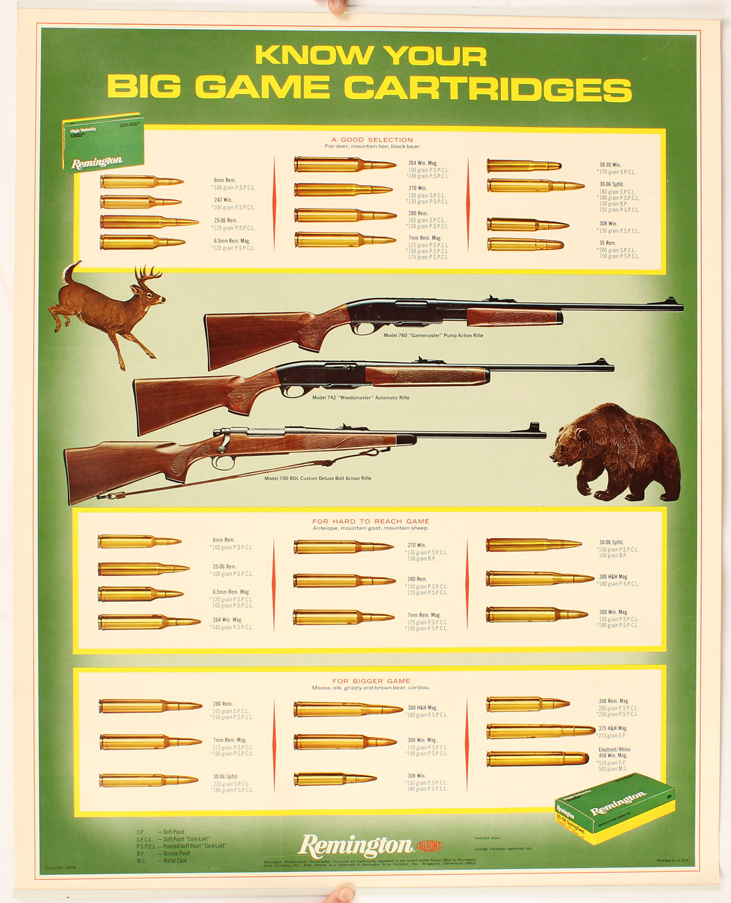 Remington KNOW YOUR BIG GAME CARTRIDGES Poster, pictures a full color image of many cartridges, has metal band top and bottom with brass hanger, (the full set could be purchased if you buy all of the ones in the next few lots), mint condition, 23'' x 29''. Grade: MINT - Value: 50 to 300