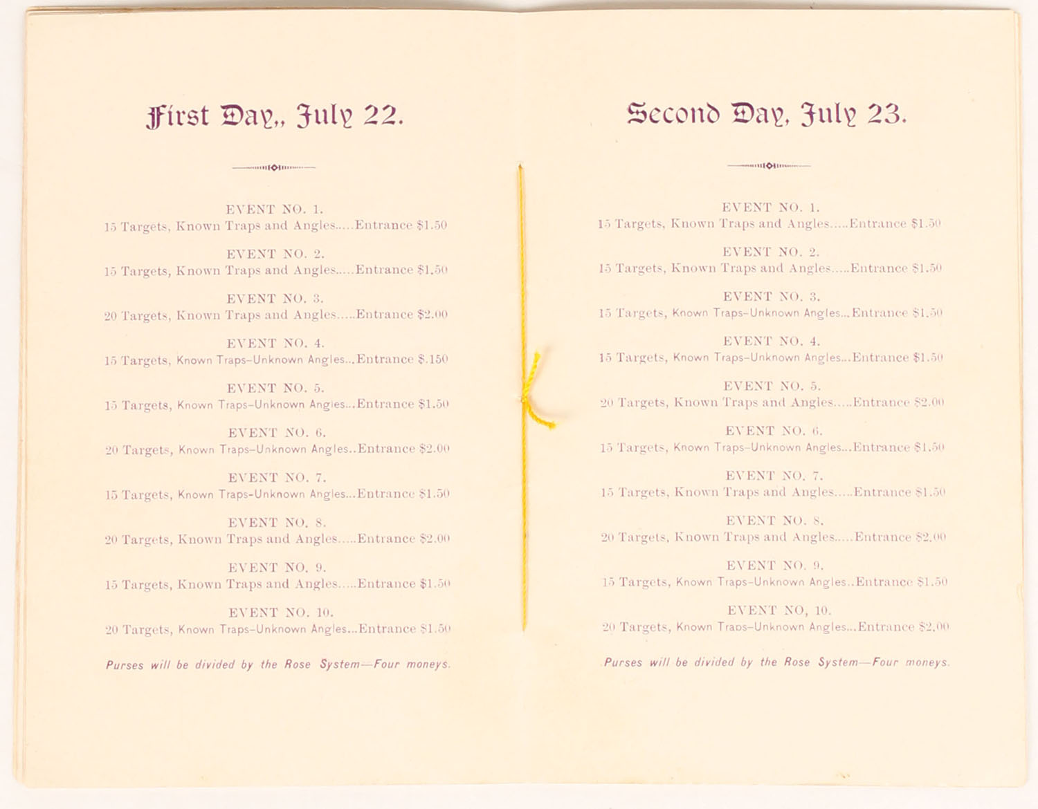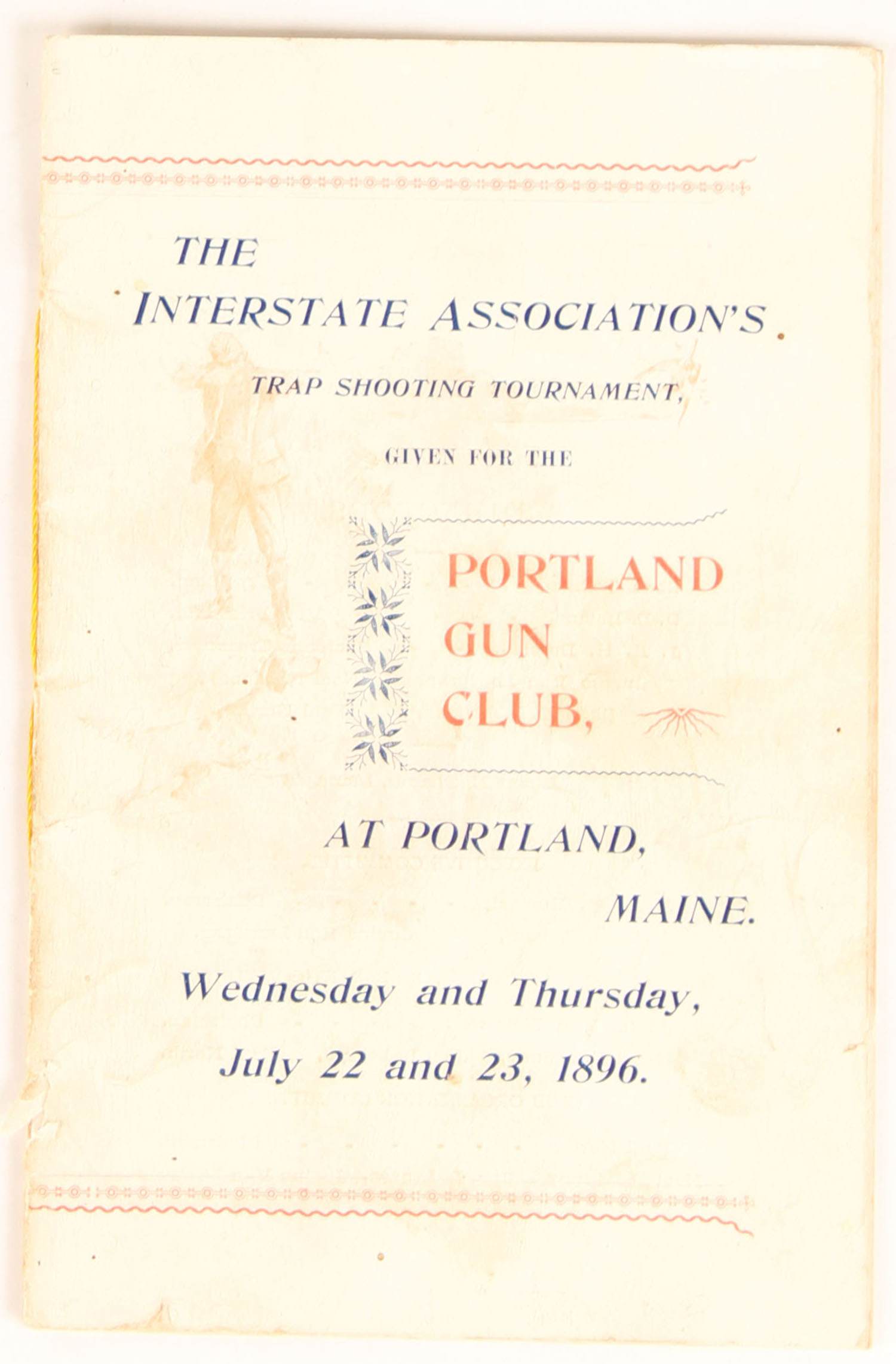 1896 Portland Maine Gun Club Trap shooting Tournament booklet, inside has lots of red printed adv for companies like UMC, VL&D, Leroy Shot and Lead Works, Hazard Powder Co., Schultze Powder Co., American E.C. Powder Co., Tatham & Brothers, Parker Bros. & Winchester, shows wear to binding & light age soiling. Grade: Very Good + - Value: 10 to 60