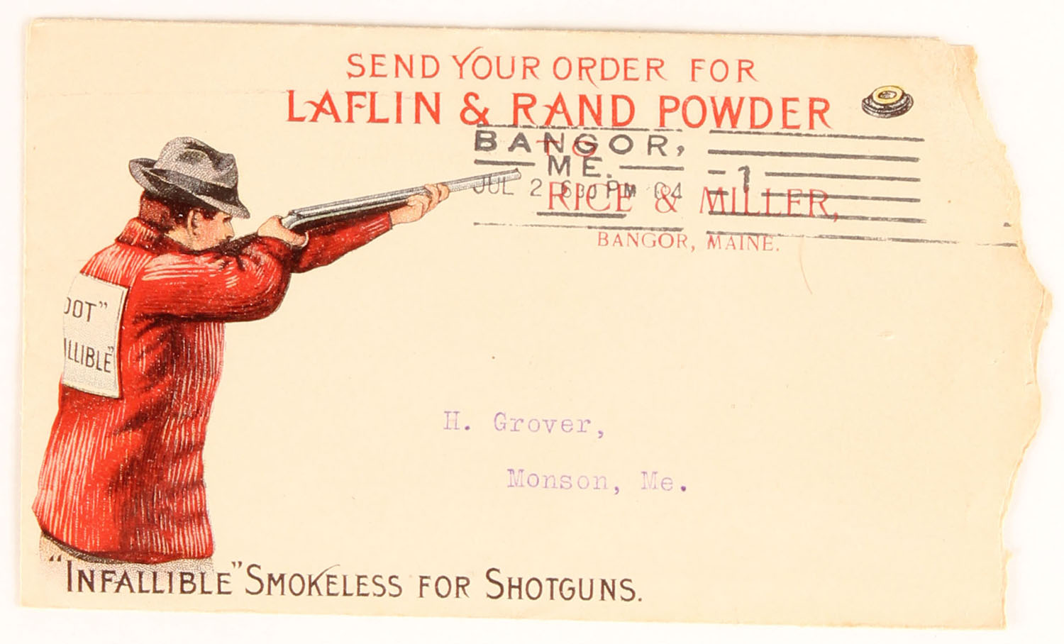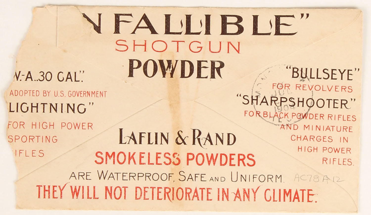 RARE Laflin & Rand Powder Co. Envelope, dated 1904, full color image of trap shooter with sign on his back ''SHOOT INFALLIBLE'', back has red & black print, torn on right side. Grade: Very Good ++ - Value: 50 to 300