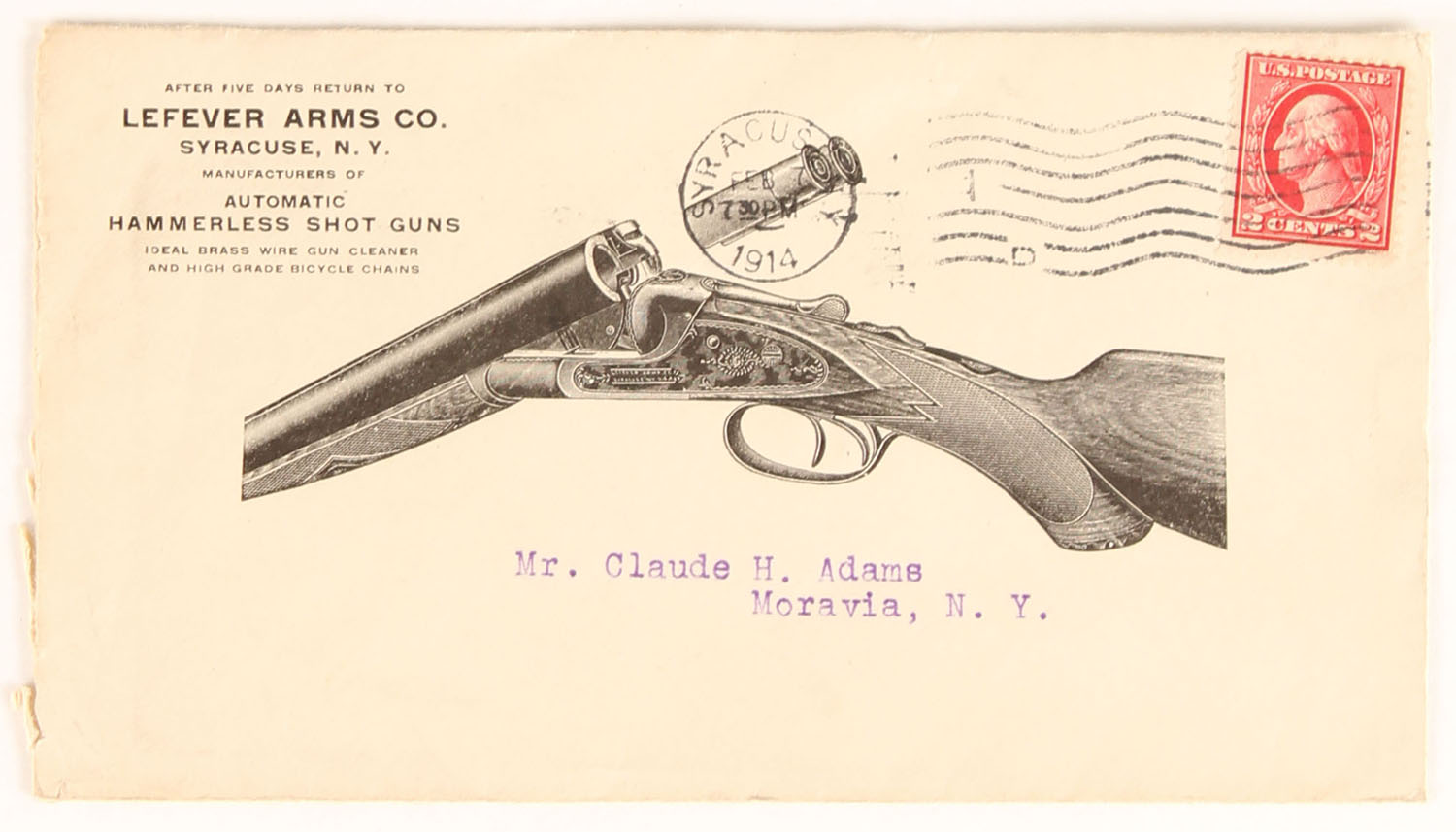 Lefever Arms Co. Envelope, dated 1914, image of double shotgun ejecting a shotshell. Grade: Excellent - Value: 50 to 300