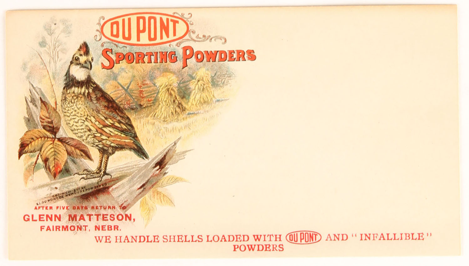 Dupont Sporting Powders envelope, has full color image of quail standing on fence, has red, blue & black print on back. Grade: Excellent ++ - Value: 40 to 150