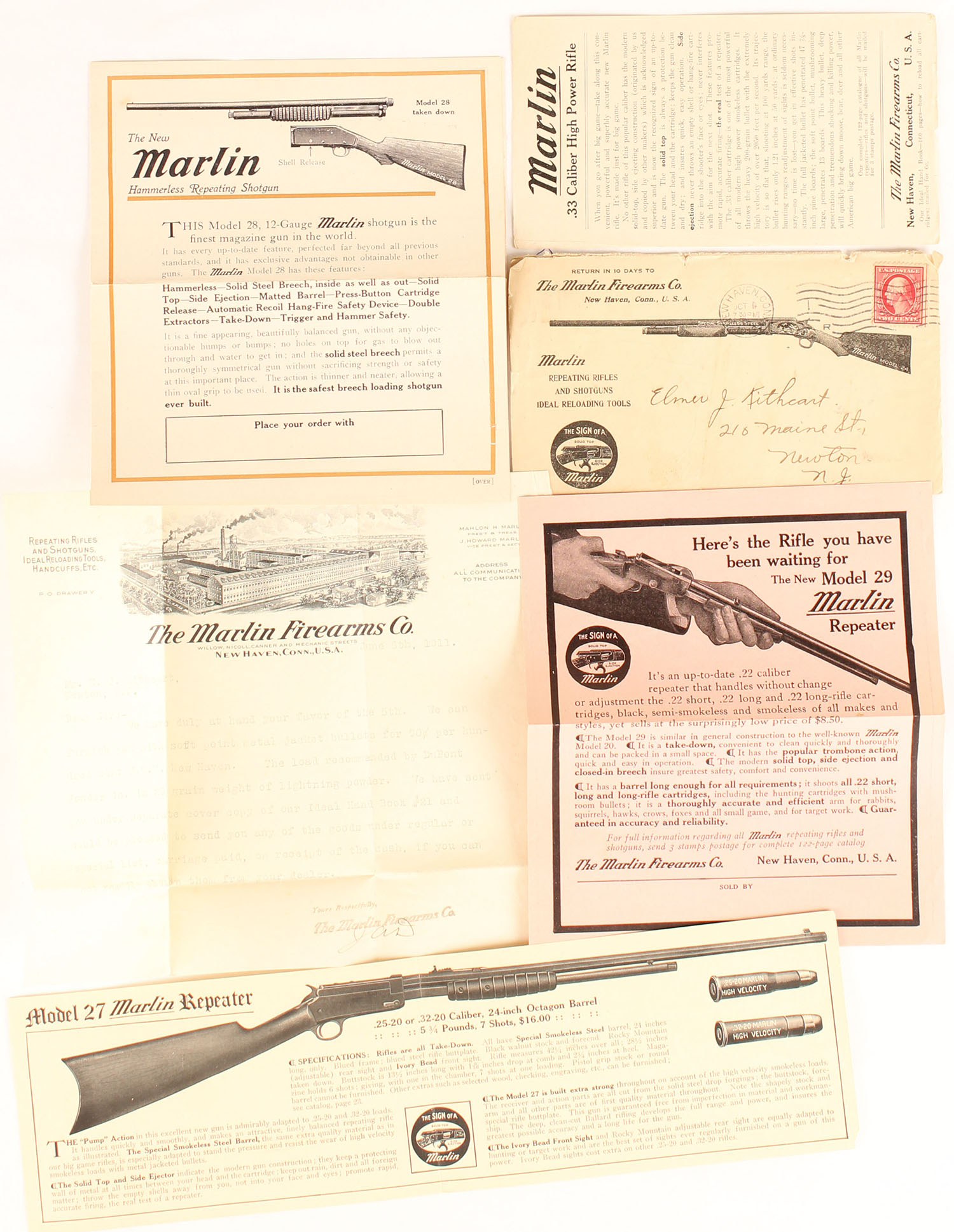 The Marlin Firearms Co. Envelope, dated 1919, pictures the model 24 shotgun, inside has lots of advertisements & one is a fold out with a full color image of the Model 28 shotgun, envelope shows wear. Grade: Very Good - Value: 10 to 60