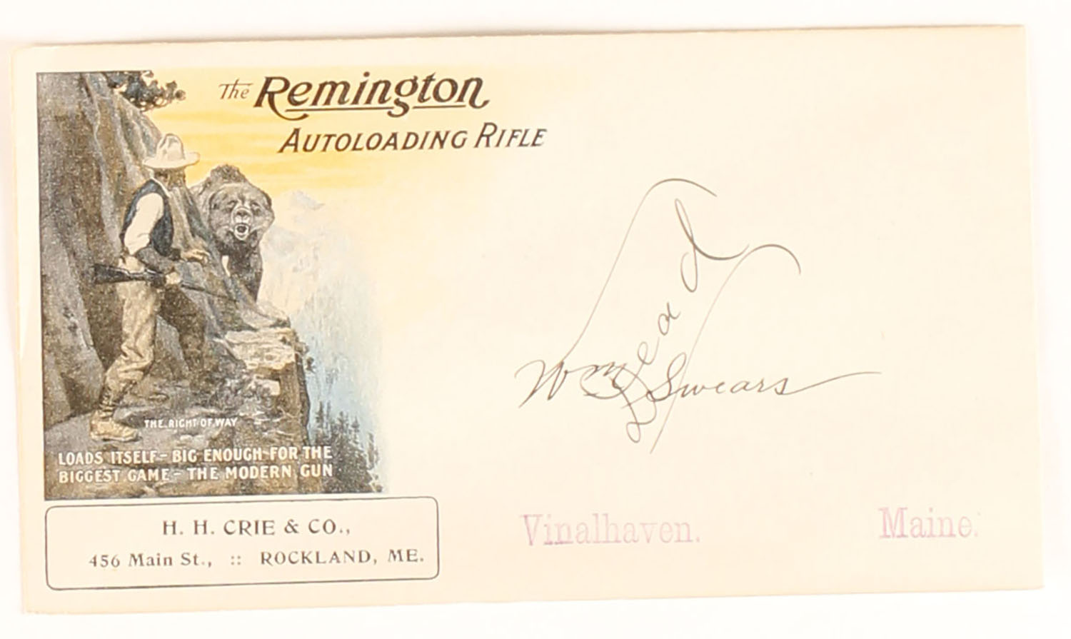 Remington Autoloading Rifle Envelope, pictures famous ''RIGHT OF WAY'', image of hunter & grizzly on cliffs edge, back has images of rifle & bullet & cartridge. Grade: Excellent + - Value: 50 to 150