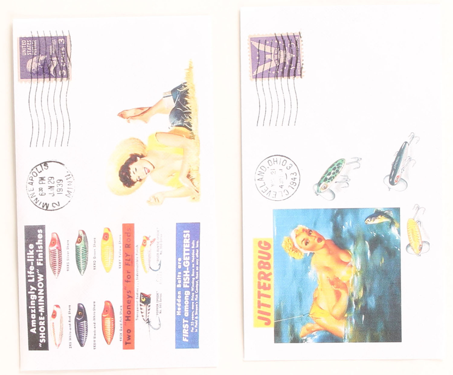 Lot of 2 Fishing Envelopes, Heddon Baits, dated 1939, has great full color images of lures & a lady laying in grass & a Jitterbug dated 1943, has colored image of baits & lady in bikini hooked by lure. Grade: Excellent - Value: 10 to 60