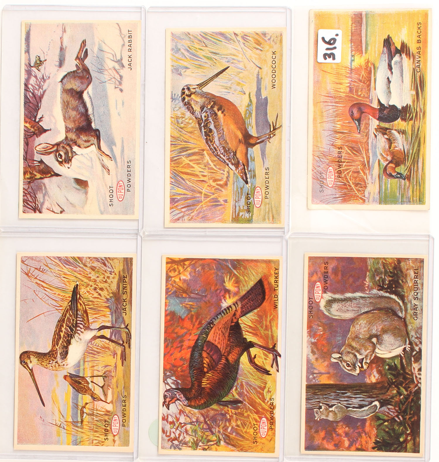 Lot of 6 SHOOT DUPONT POWDERS, Postcards, each one has a full color image of game birds or animals, only the Canvasback is used & dated 1916. Grade: Excellent ++ - Value: 50 to 200