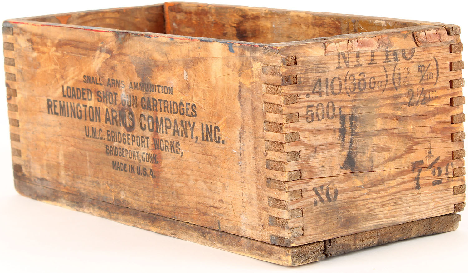 Remington UMC, 410 Ga., nail construction, red, & black print is faded and crate has age soiling. Grade: Very Good - Value: 10 to 50