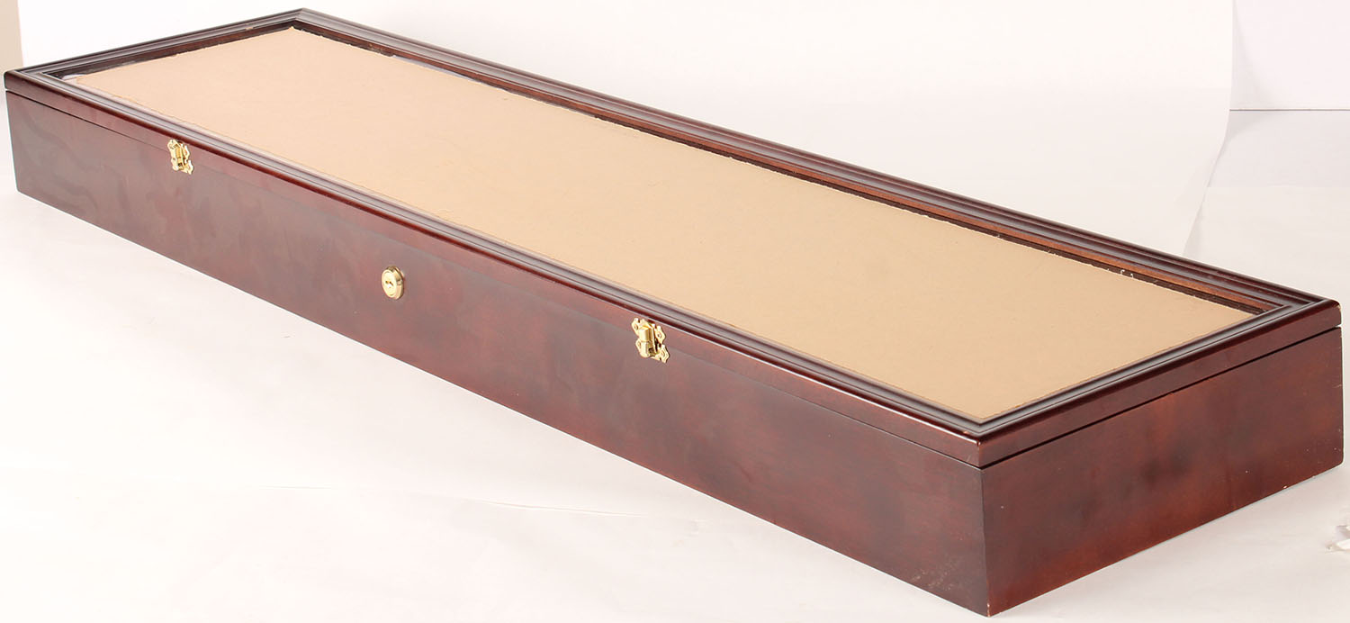 Large Glass Wood gun display case, 45'' x 11'' x 4'', beautiful wood box. Grade: Excellent ++ - Value: 50 to 300