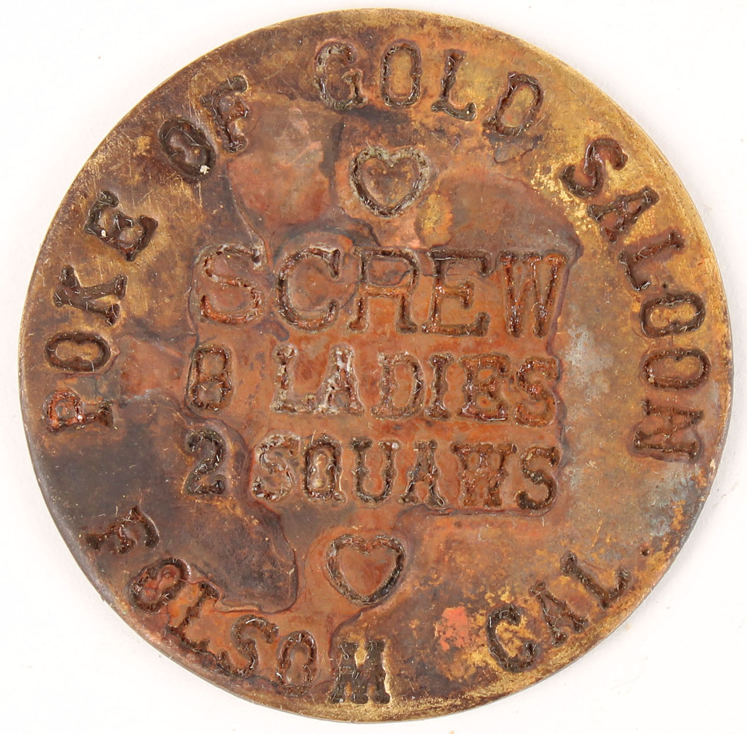 Double sided Brothel Token. ''Poke of Gold Saloon Folsom Cal.''. Grade: Excellent - Value: 6 to 40