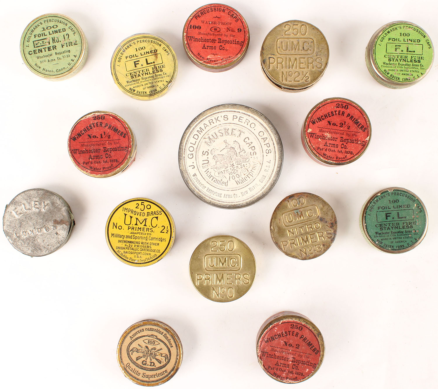 Large lot of primer tins, some sealed, some partial, some age soiling. Grade: Very Good ++ - Value: 20 to 100