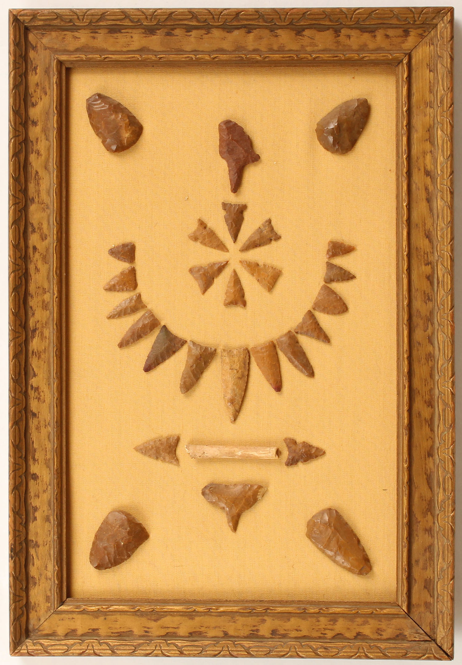 Large lot of arrow heads, all displayed on a wood frame(12'' x 9''). Grade: Excellent - Value: 20 to 100