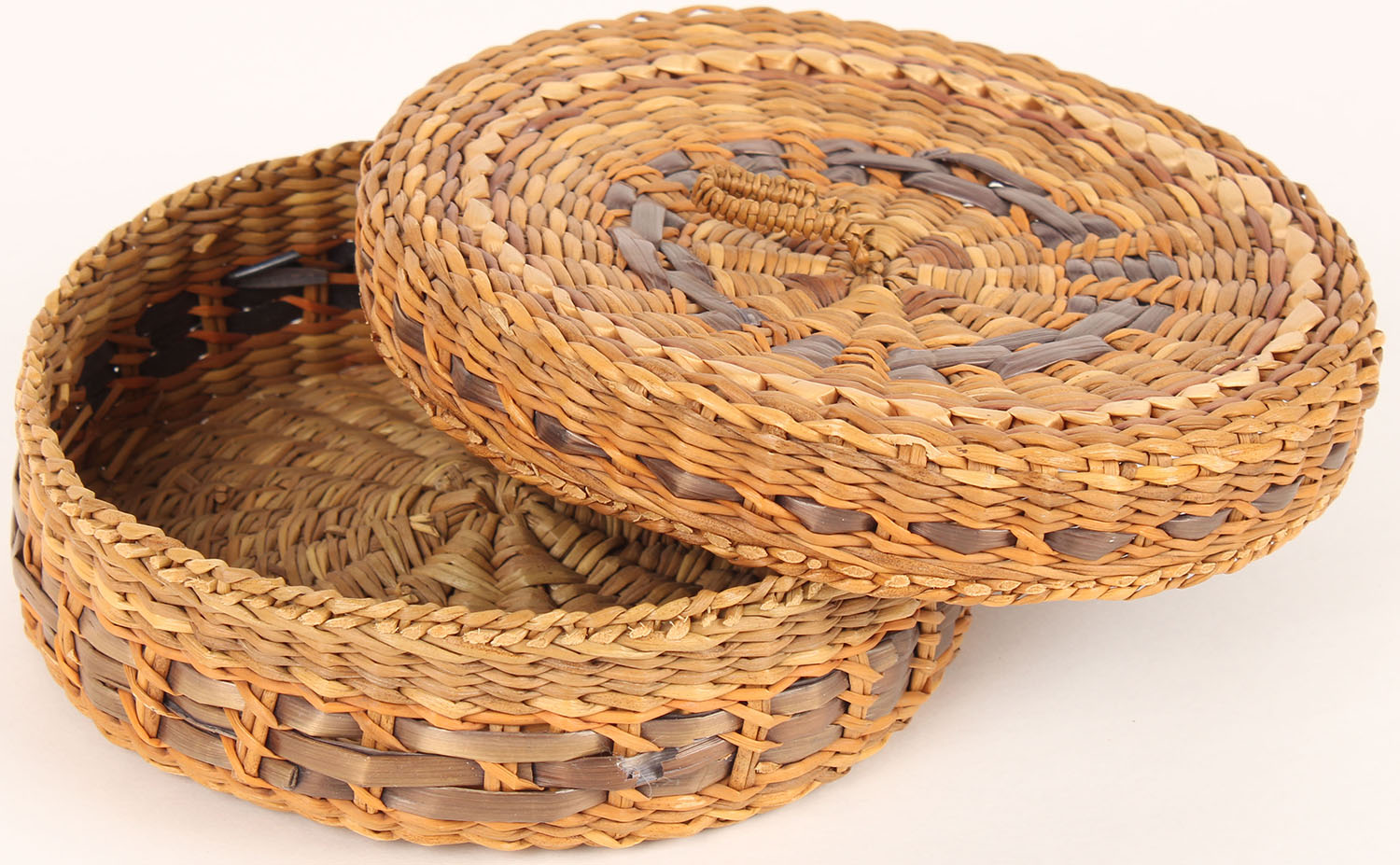 Southeast Indian 5 1/2'' wide lidded reed basket. Grade: Excellent - Value: 40 to 200