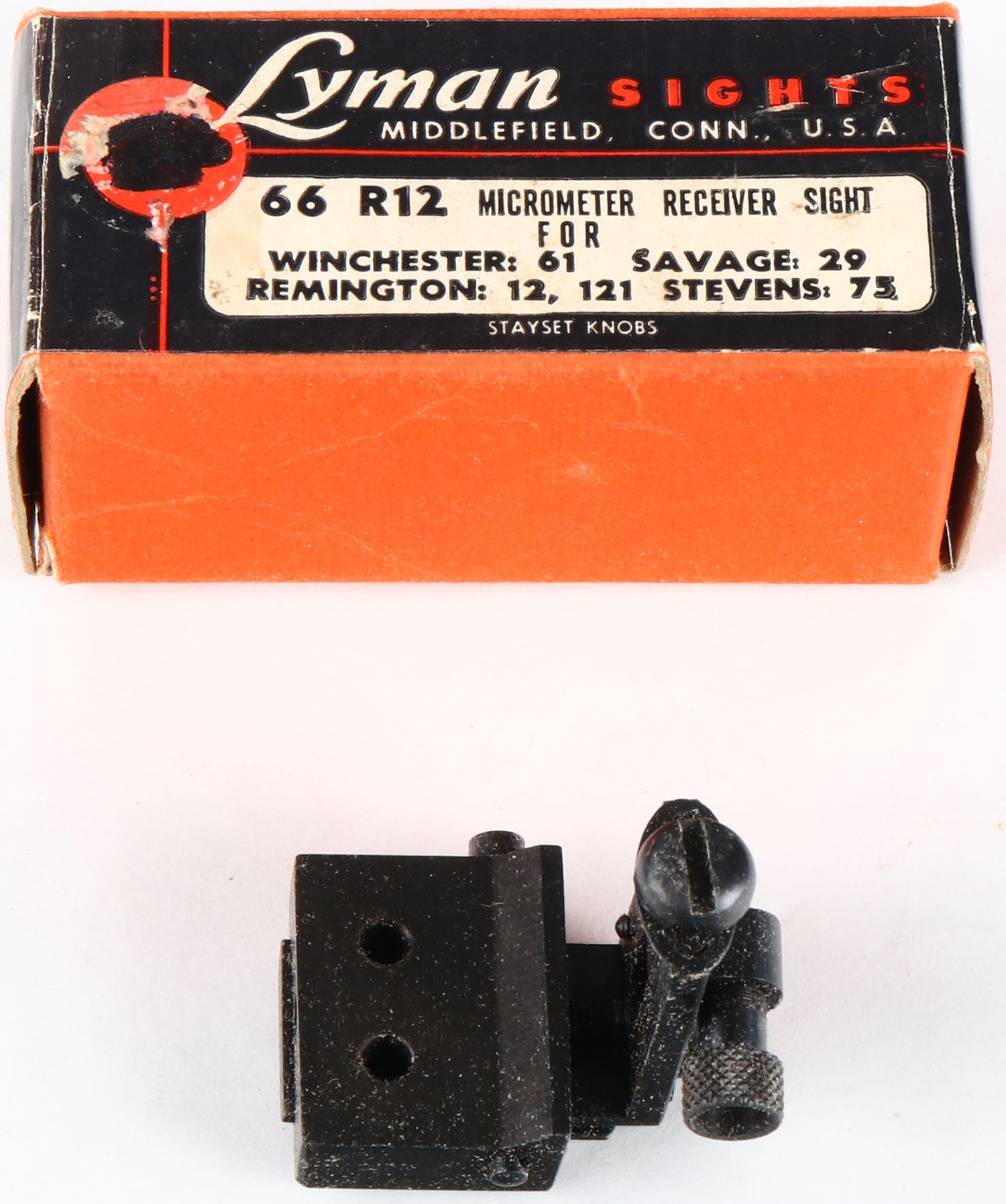 Lyman 66 R12 Micrometer receiver sight, in orginal box with screws, instructions and paper. Grade: Excellent - Value: 50 to 300