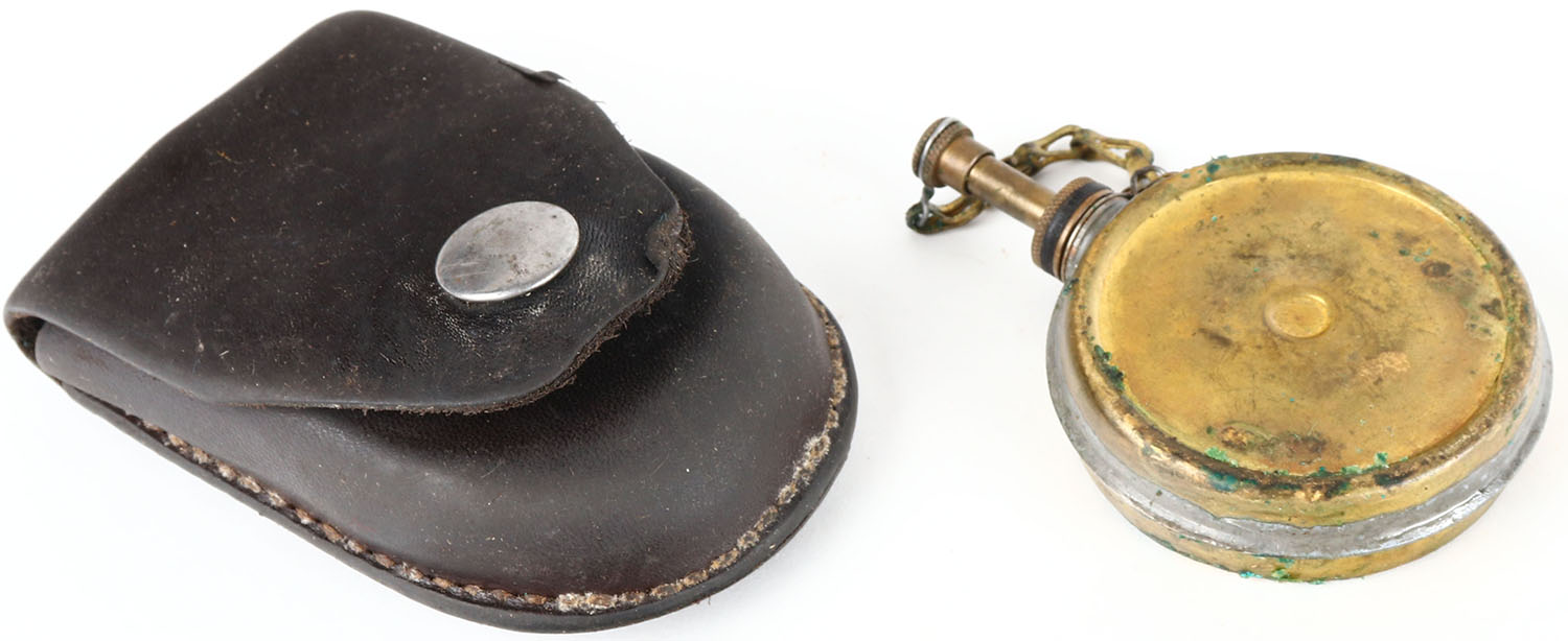 unmarked brass oil tin with early leather pouch. Grade: Very Good - Value: 6 to 50