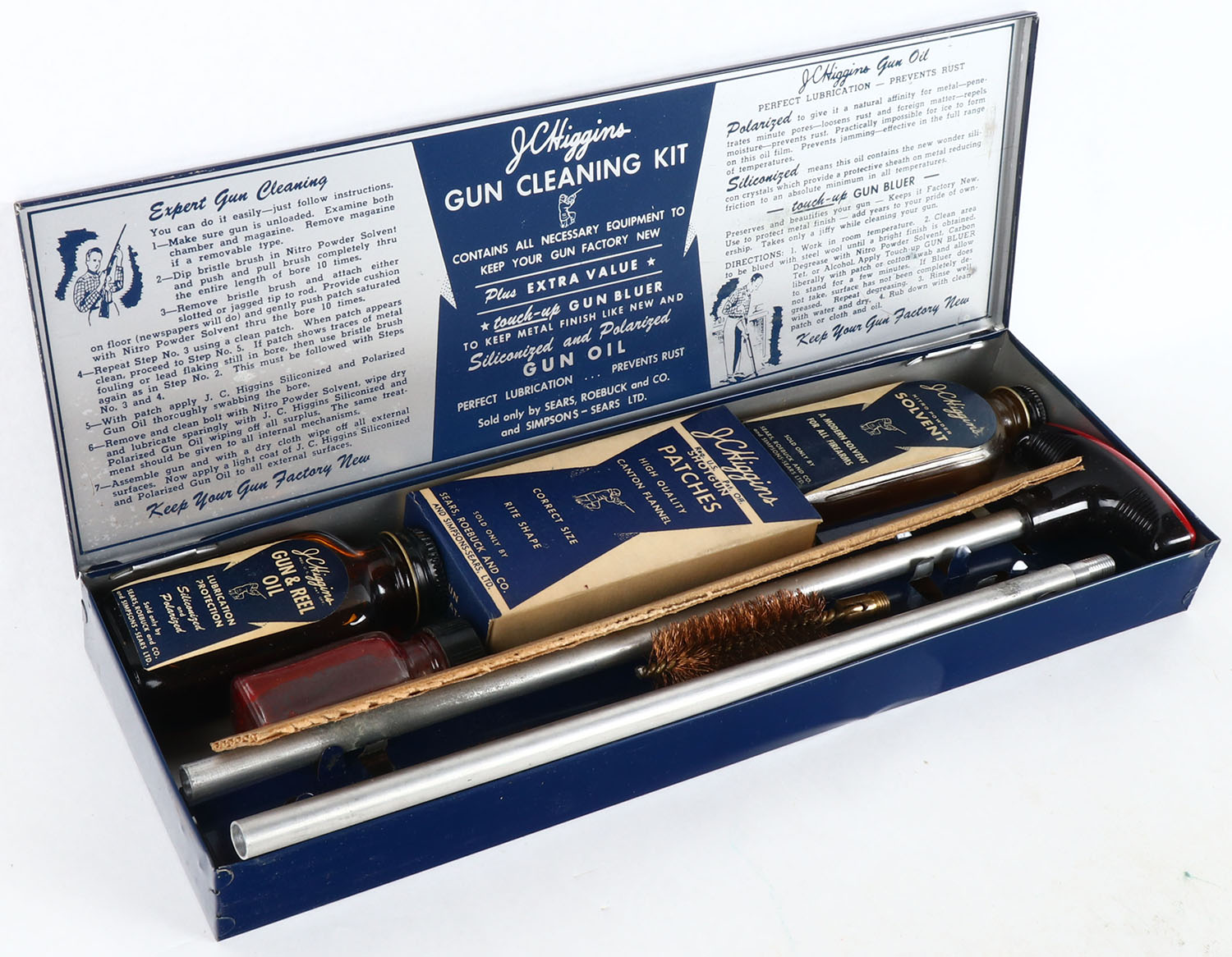 Sears Ted Williams Rifle Cleaning Kit, .22 & .30 cal., oil tin & solvent bottle. Grade: Excellent - Value: 10 to 50