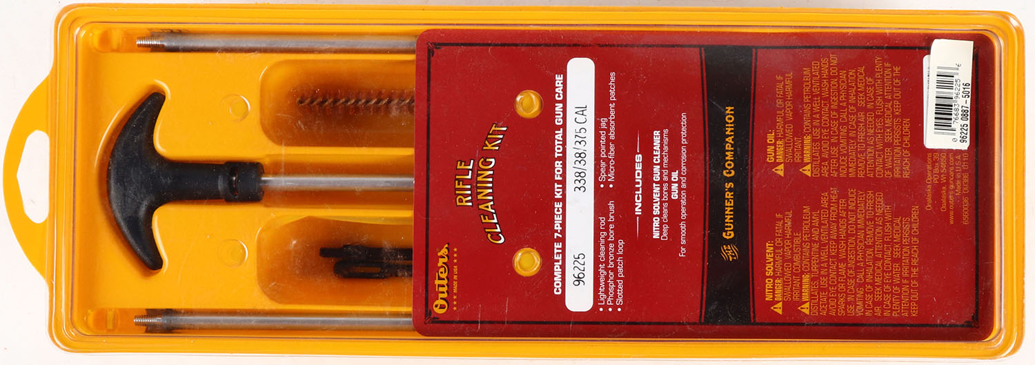 Outers Rifle Cleaning Kit, .338/38/375 cal., No. 96225, oil & solvent bottle. Grade: Excellent - Value: 10 to 30