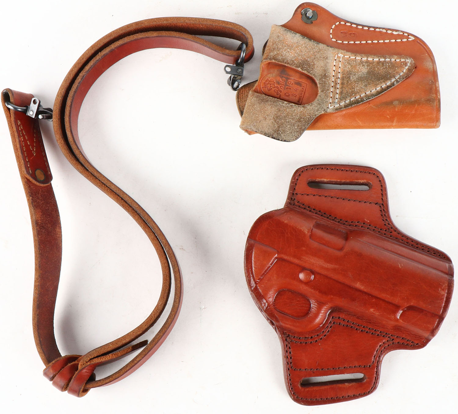Lot of 2 leather holster , S&W and Tagua and a leather rifle sling. Grade: Excellent - Value: 10 to 50
