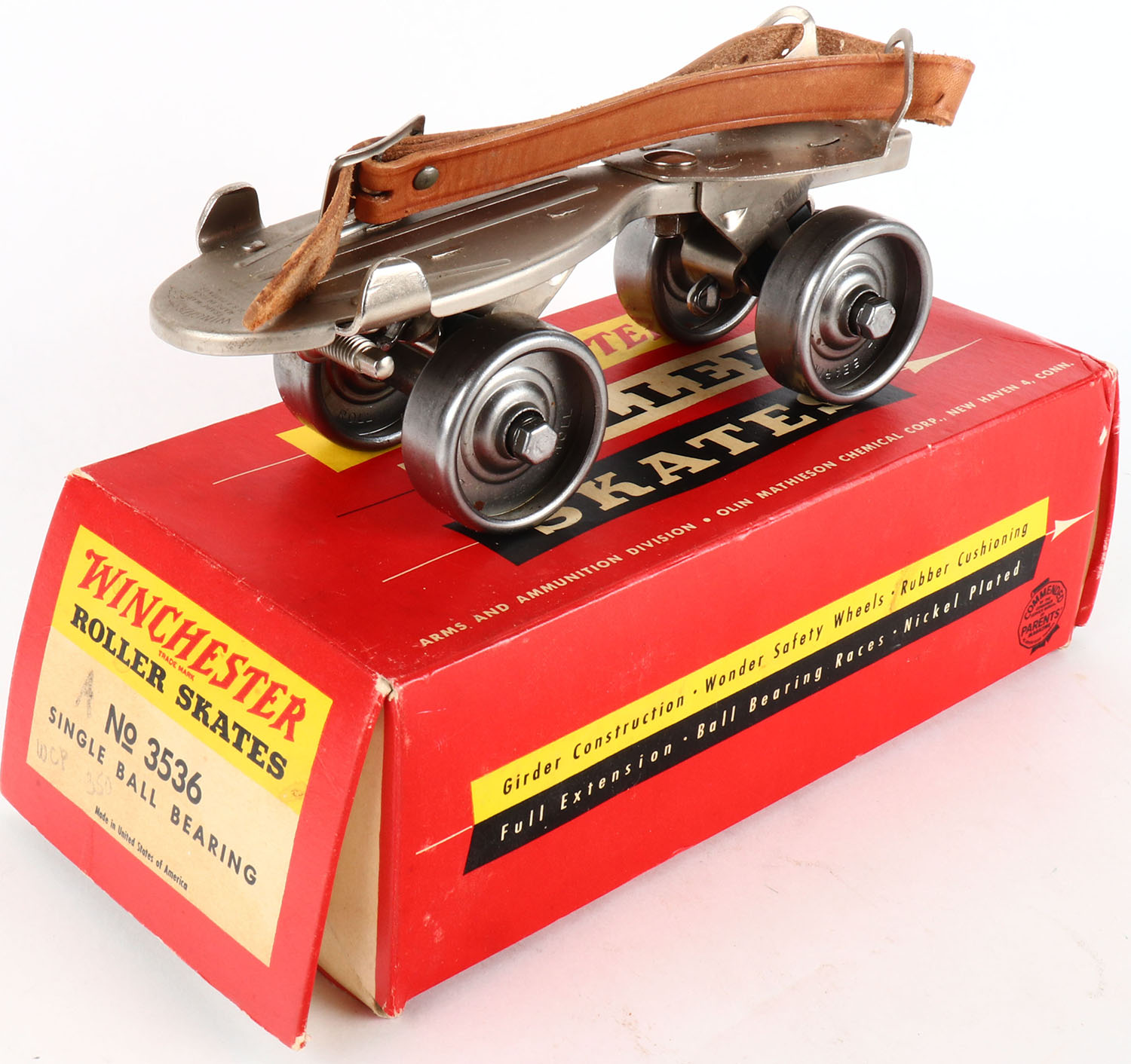 Winchester Roller Skates No 3536, Single Ball Bearing, has leather straps, skates are near mint & boa is very nice. Grade: Excellent ++ - Value: 10 to 100