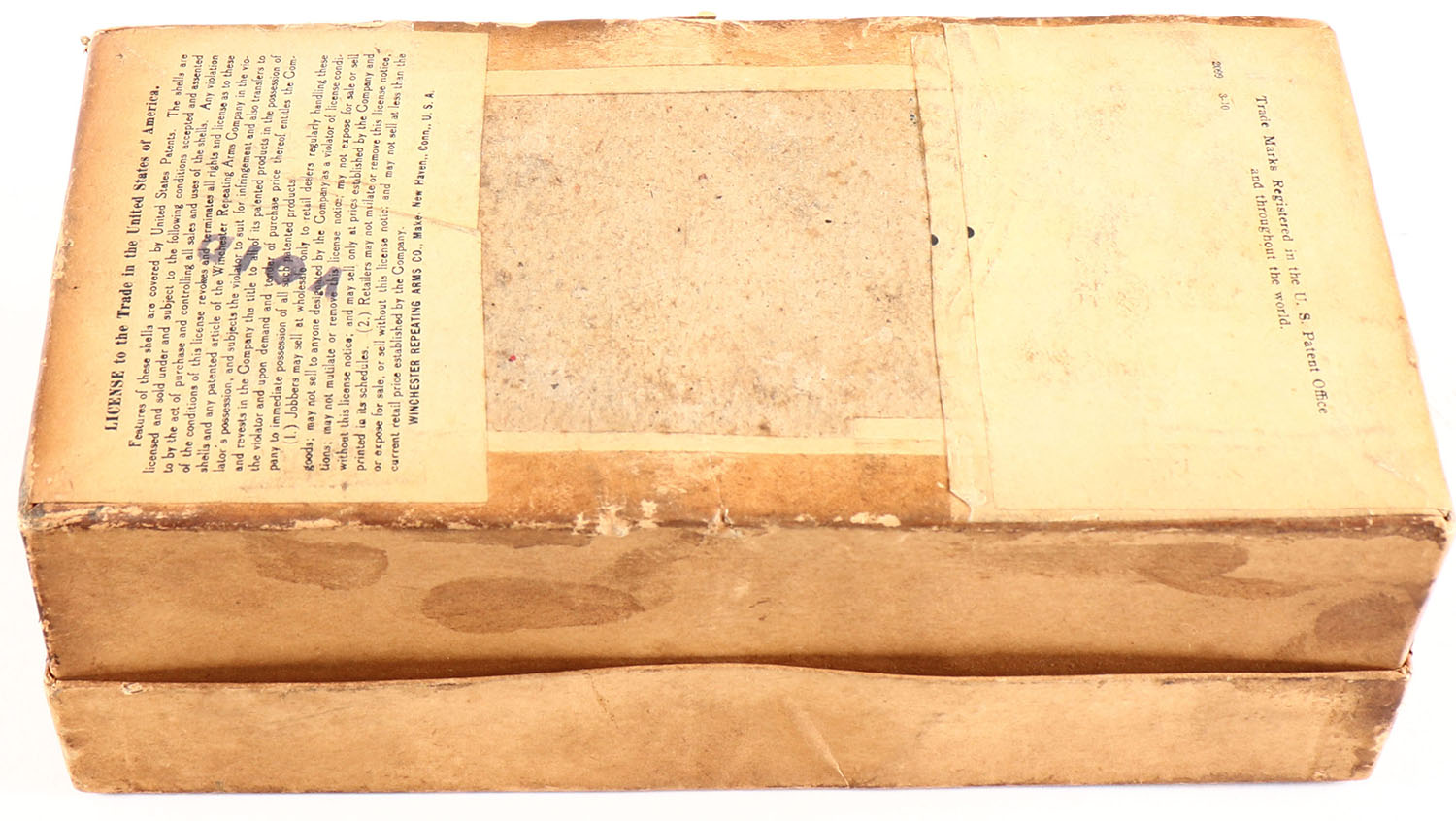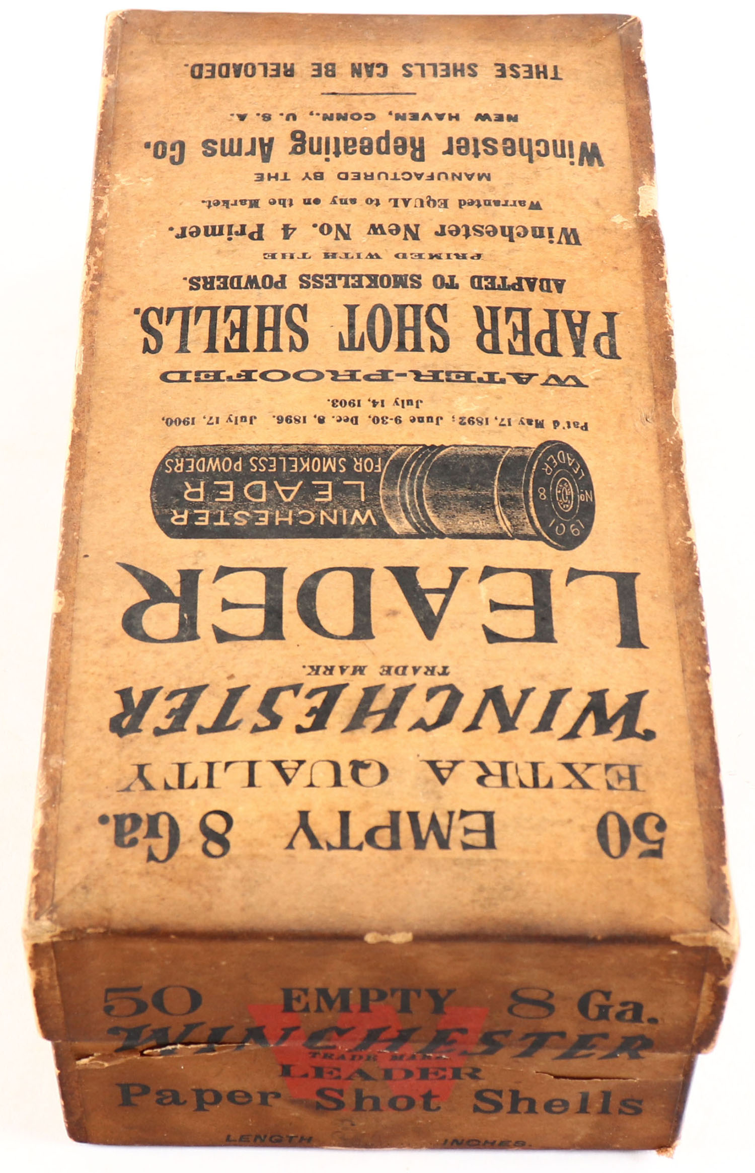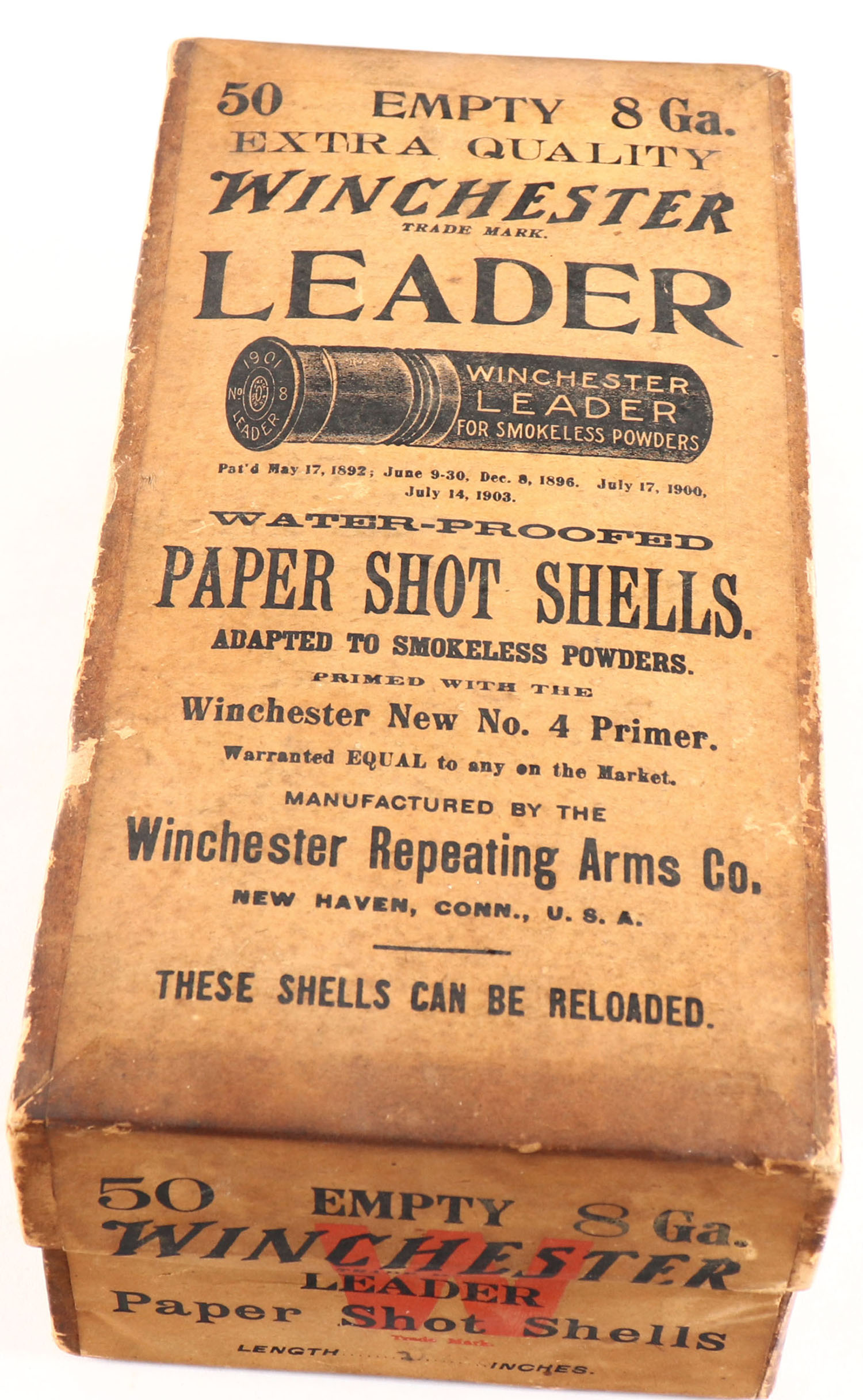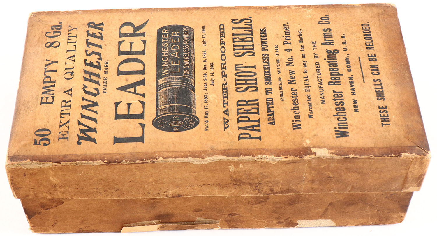 Winchester SHOE BOX Leader, 50 ct., 8ga, 2pc., FULL & SEALED of NPE, buff box with buff and black label, box has age soiling, light edge wear. Grade: Excellent + - Value: 400 to 1000