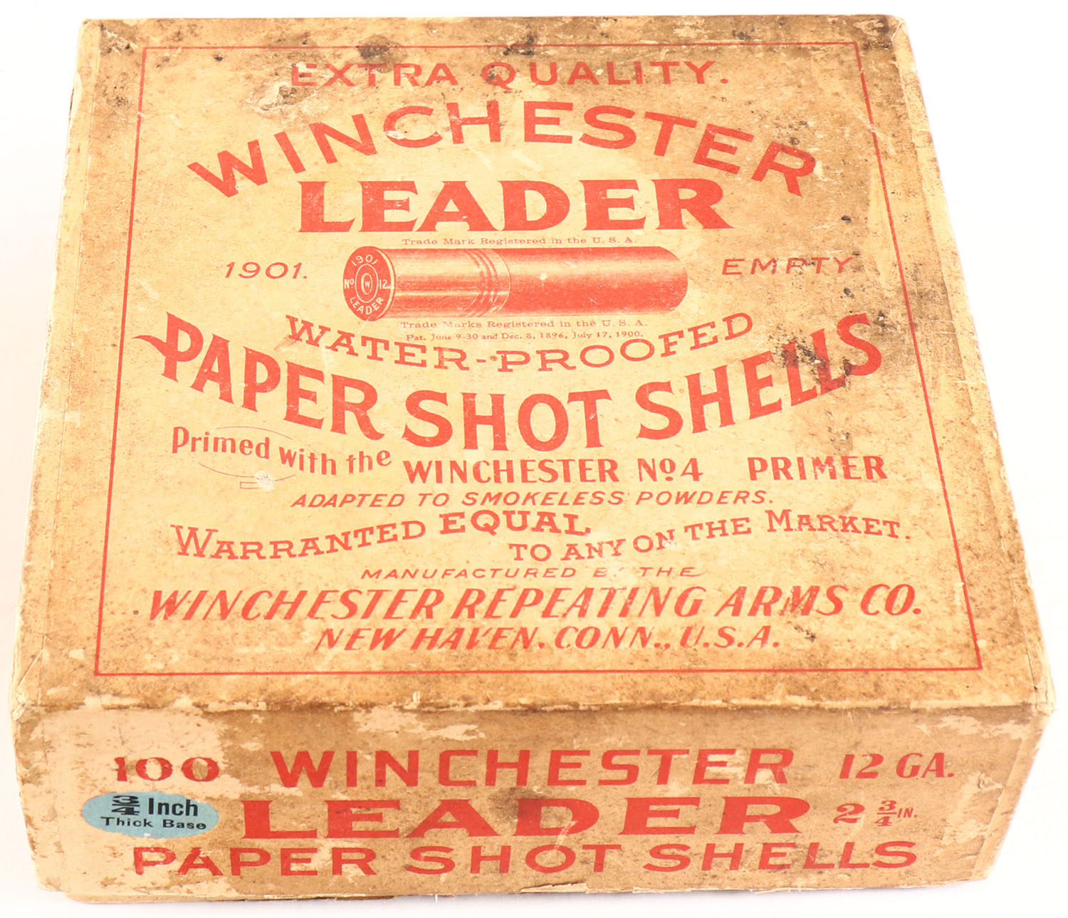 Winchester Leader, 12 ga, 2pc., Full of NPE, 2 3/4'', buff box with buff and red label, box has age soiling, light edge wear, with some scuffing, Shells are excellent. Grade: Very Good ++ - Value: 200 to 500