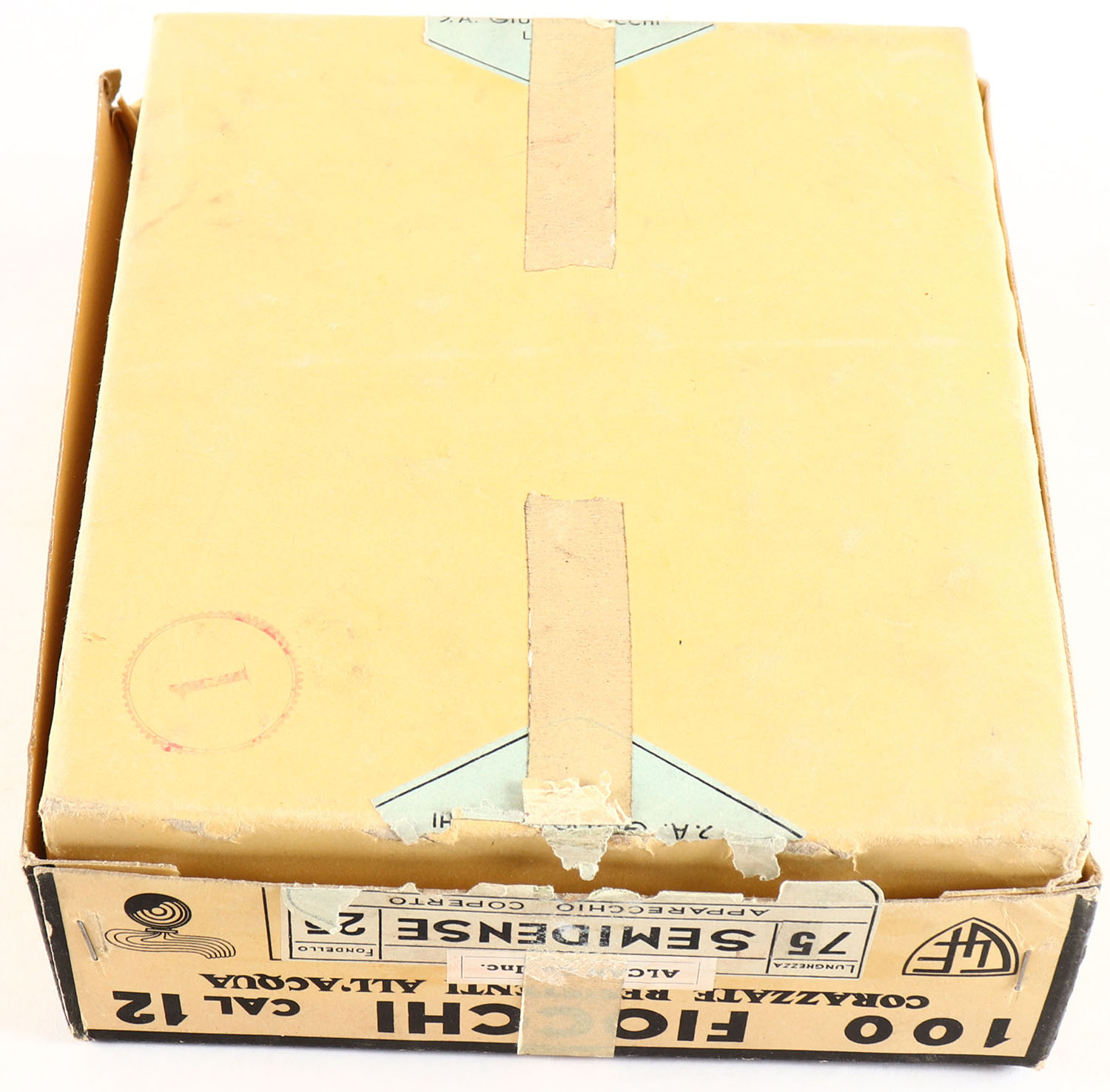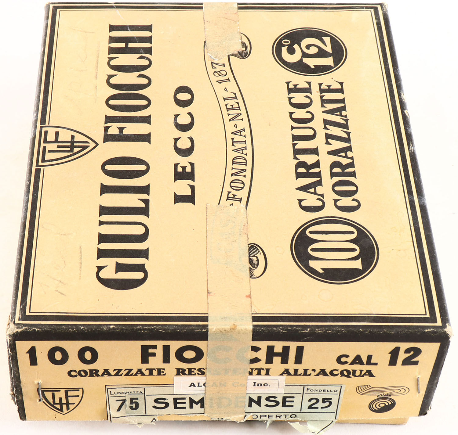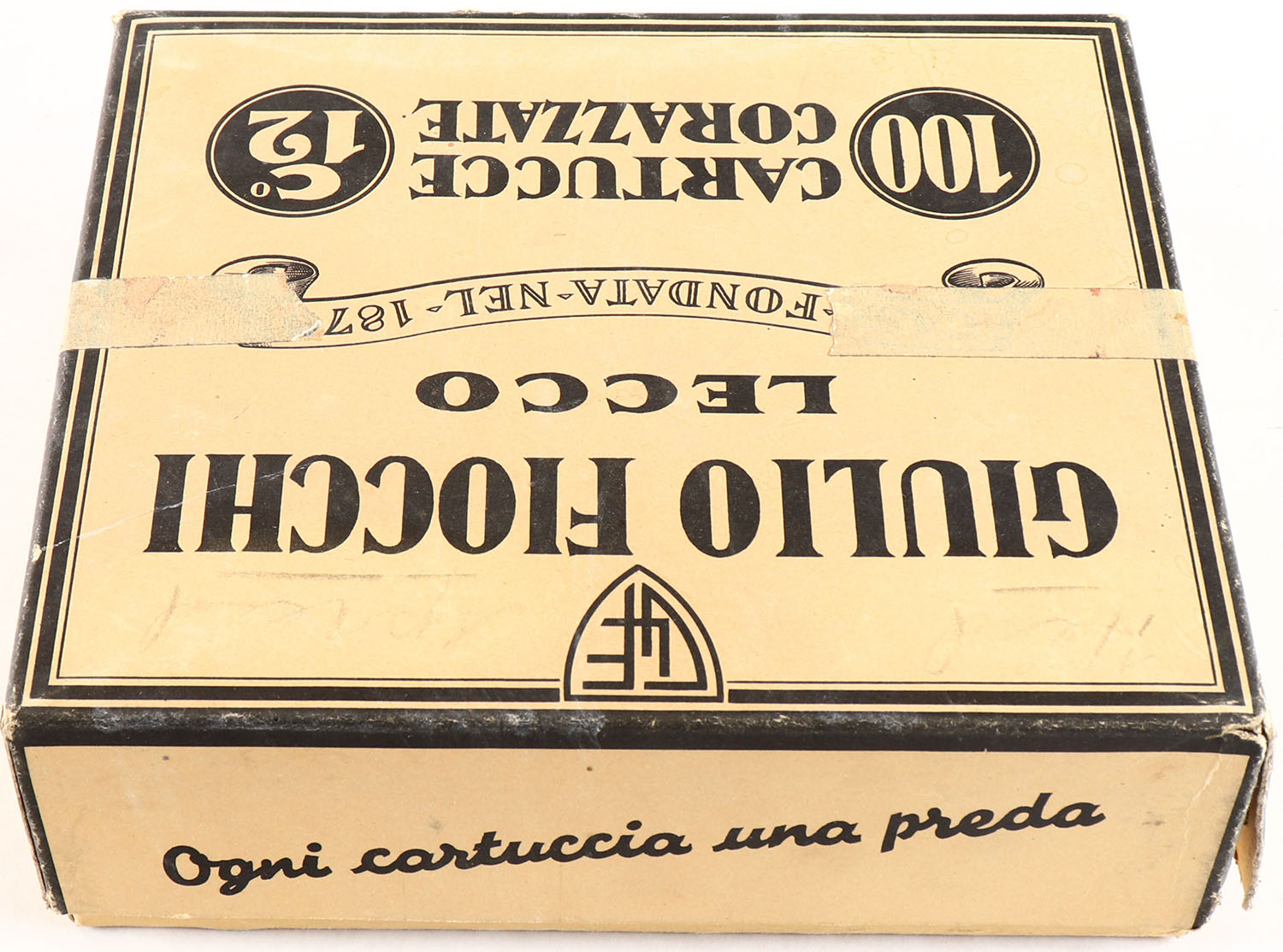 Giulio Fiocchi, NPE, 12 ga, 2 pc., Partial 90 %, buff box with black and buff label, box has some scuffing with light age soiling, Shells are very good. Grade: Very Good ++ - Value: 60 to 200