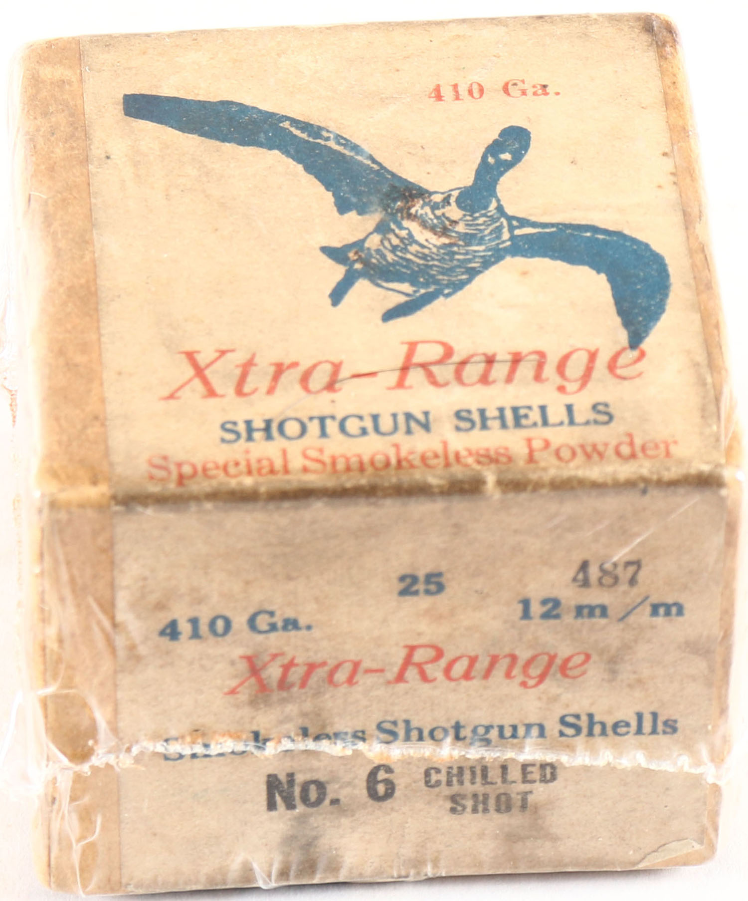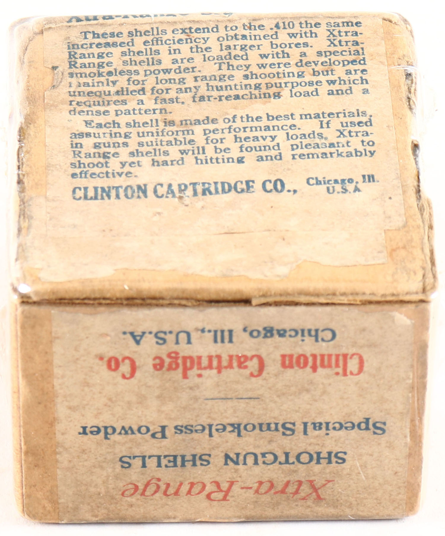 Clinton Cart Co., Xtra-Range, RARE 410 GAUGE!, 2pc., Empty, shot size 6ch, buff box with multi colored label, box is very solid, label is very good with some age soiling. Grade: Very Good ++ - Value: 200 to 1200