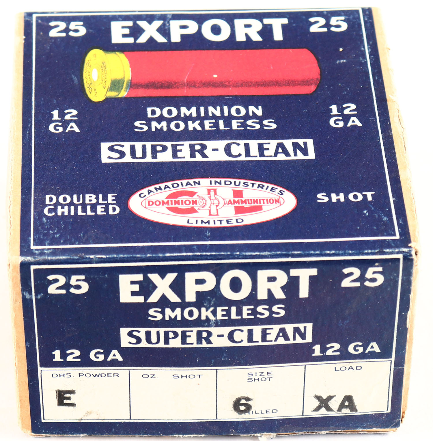 RARE Dominion Cartridge Co, EXPORT, 12ga., 2pc., Full, shot size 6, box is very solid with great color to label. Bottom has shell protrusions, Shells are excellent. Grade: Excellent - Value: 100 to 500