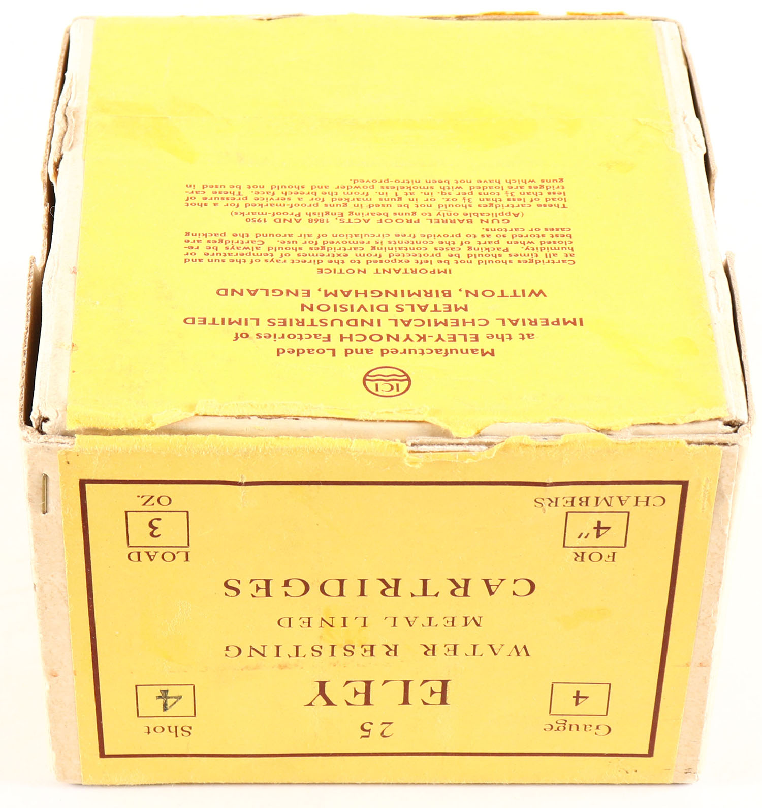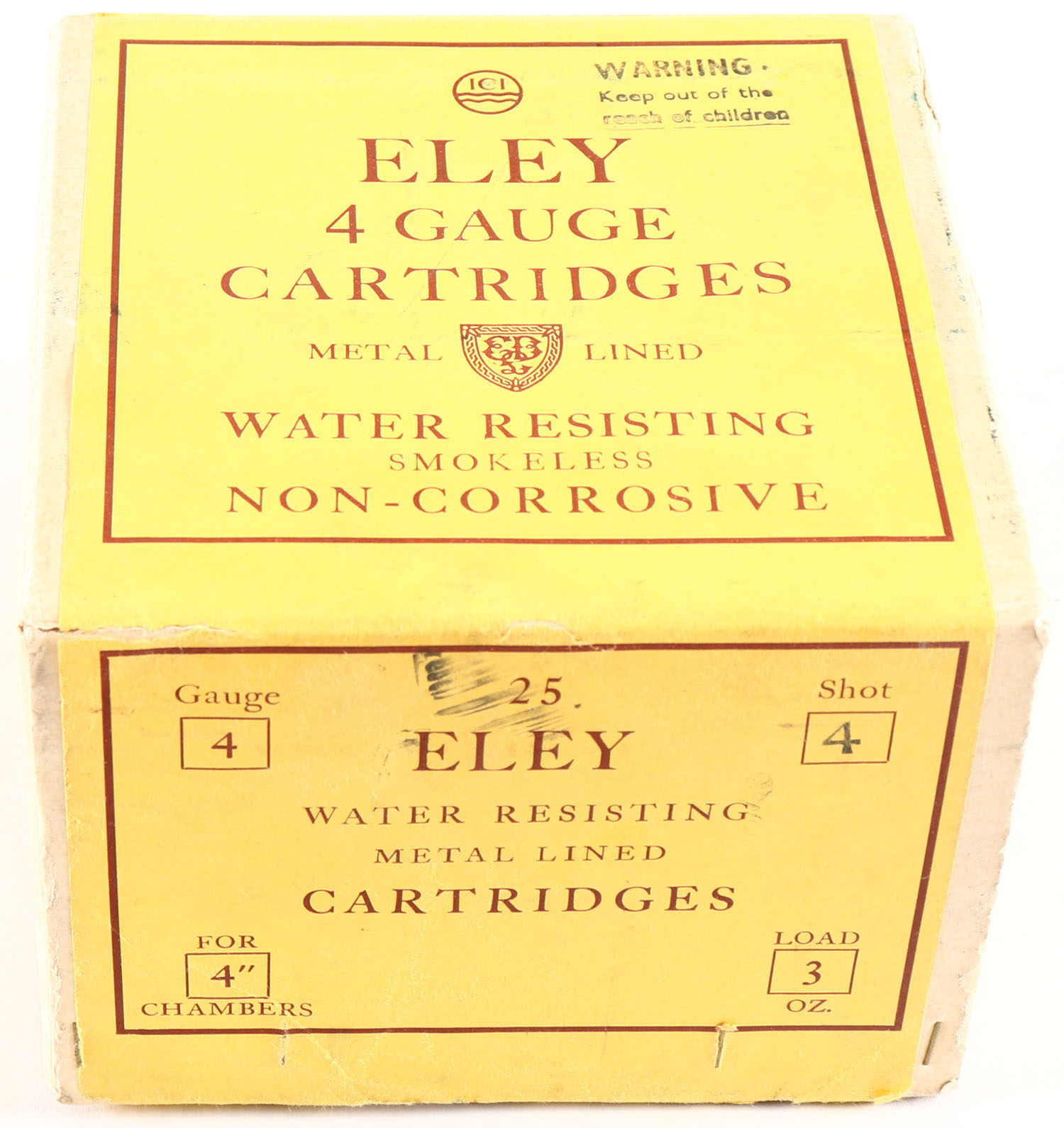 Eley, 4ga, 2pc., Partial 2rds, shot size 4, 4'', buff box with yellow & maroon label, box is solid with great color to label. Shells are excellent. Grade: Excellent - Value: 100 to 600