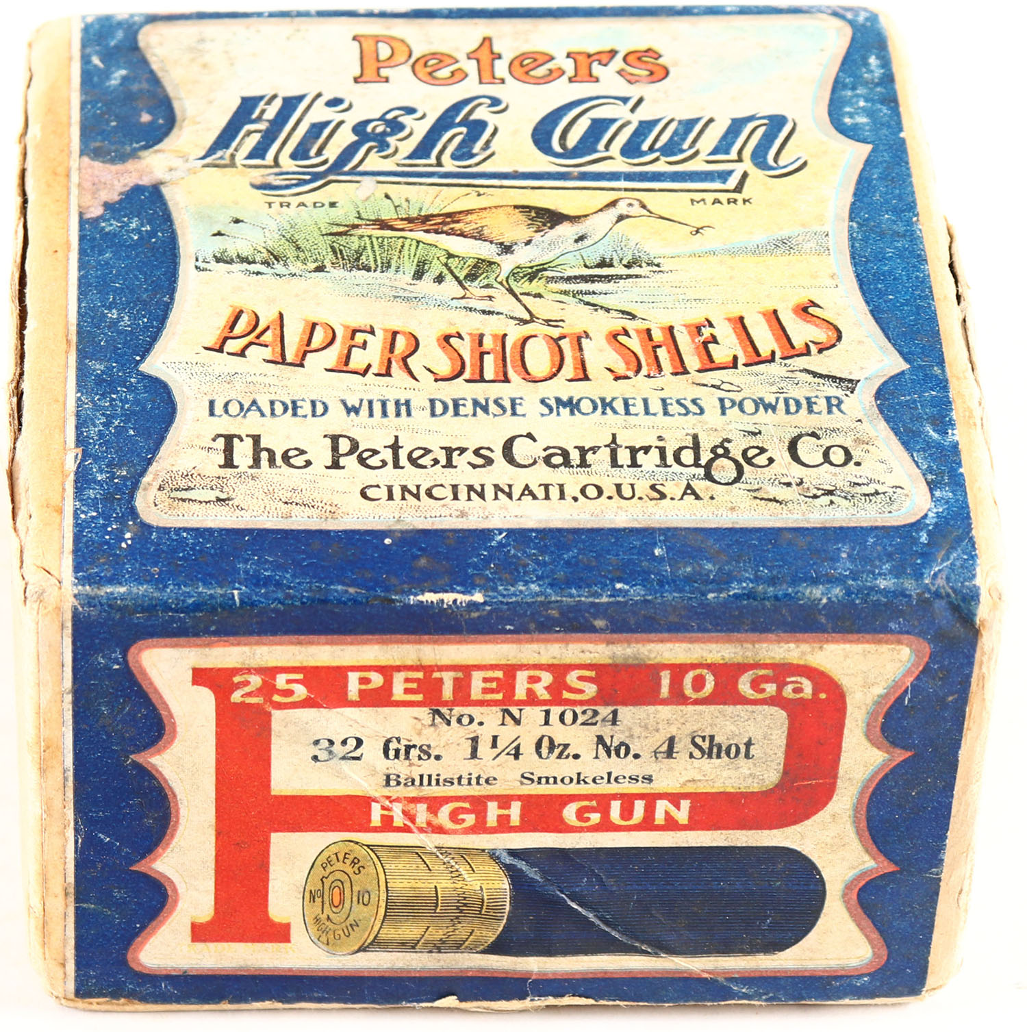 Peters Cart. Co., HIGH GUN, 10ga, 2pc., Full of High Velocity Shells, shot size 4, buff box with multi colored picture of Snipe, Loading: No. N 1024, 32 Grs., 1 1/4 Oz. No. 4 Shot, Ballistite Smokeless, box has a seam split, label is very good. Grade: Very Good ++ - Value: 500 to 2000