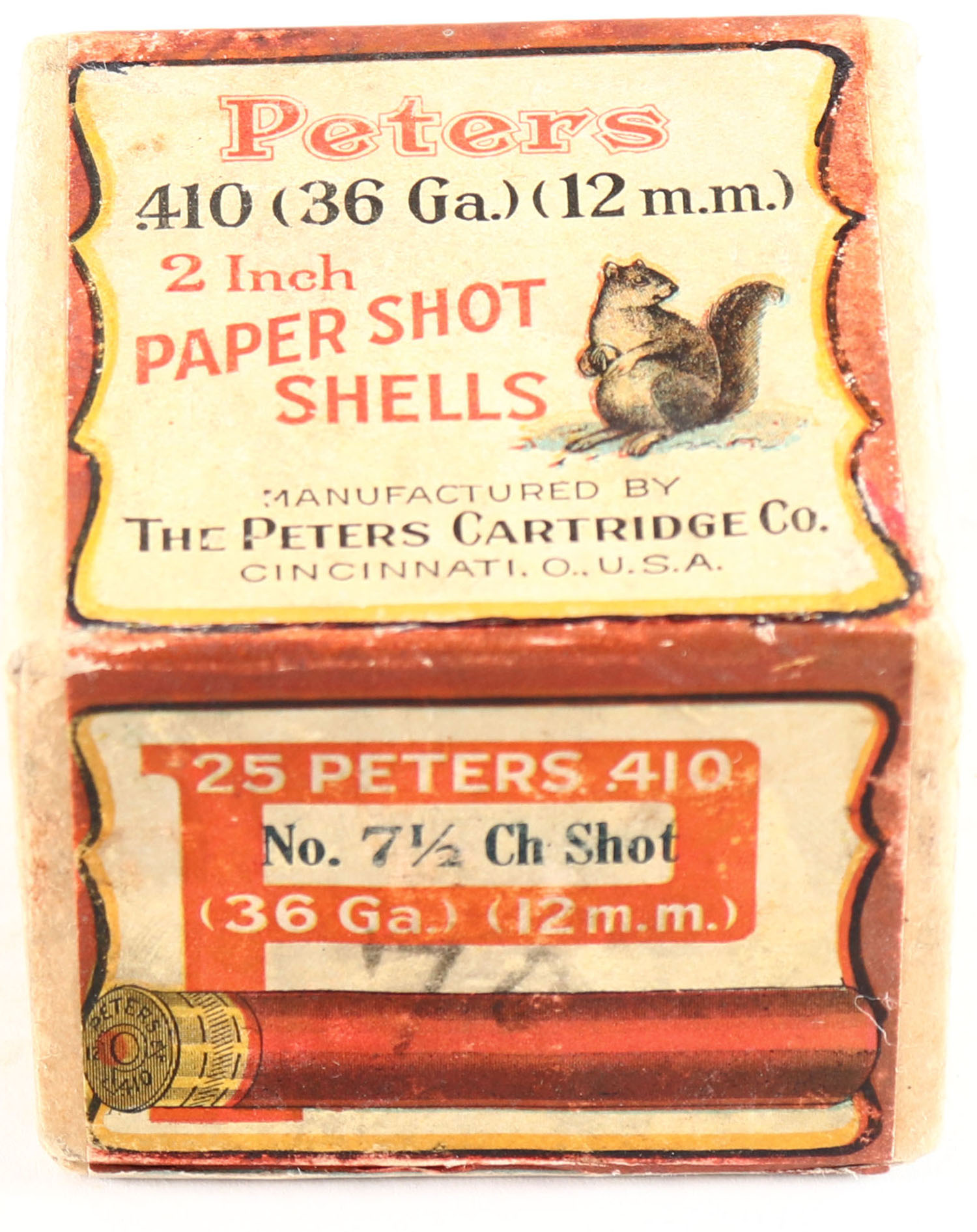 Peters Cart. Co., Paper Shot Shells, 2''. SQUIRREL BOX!!!, RUSTLESS, 410 (36Ga.) (12m.m.). GAUGE!!!, 2pc., FULL & SEALED, shot size 7 1/2CH, buff box with multi-colored label with Squirrel on front, box has been professionally resealed otherwise 98% original label, box has great colors. Cincinnati, O. USA., VERY RARE. Grade: Excellent + - Value: 1000 to 3000