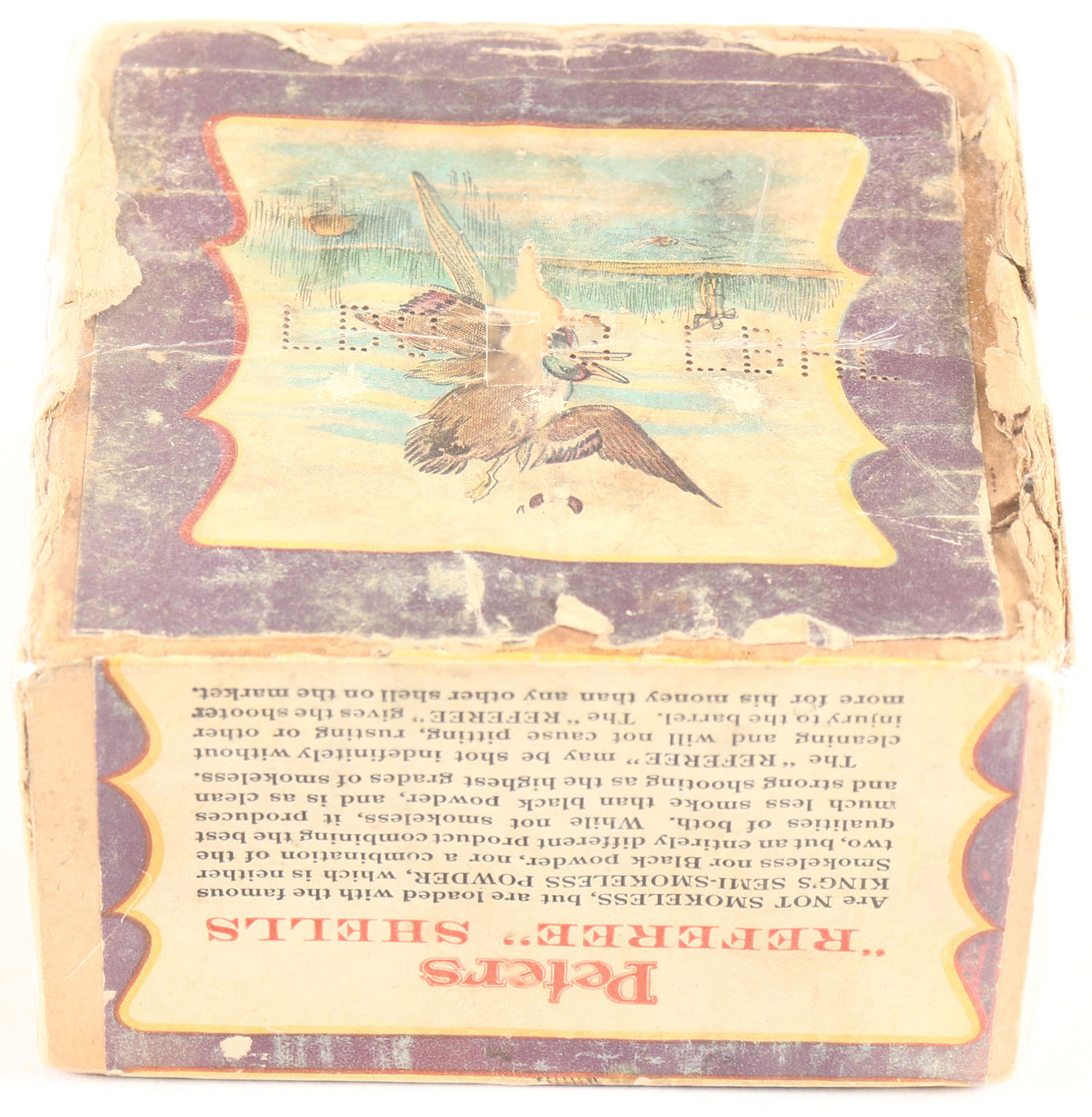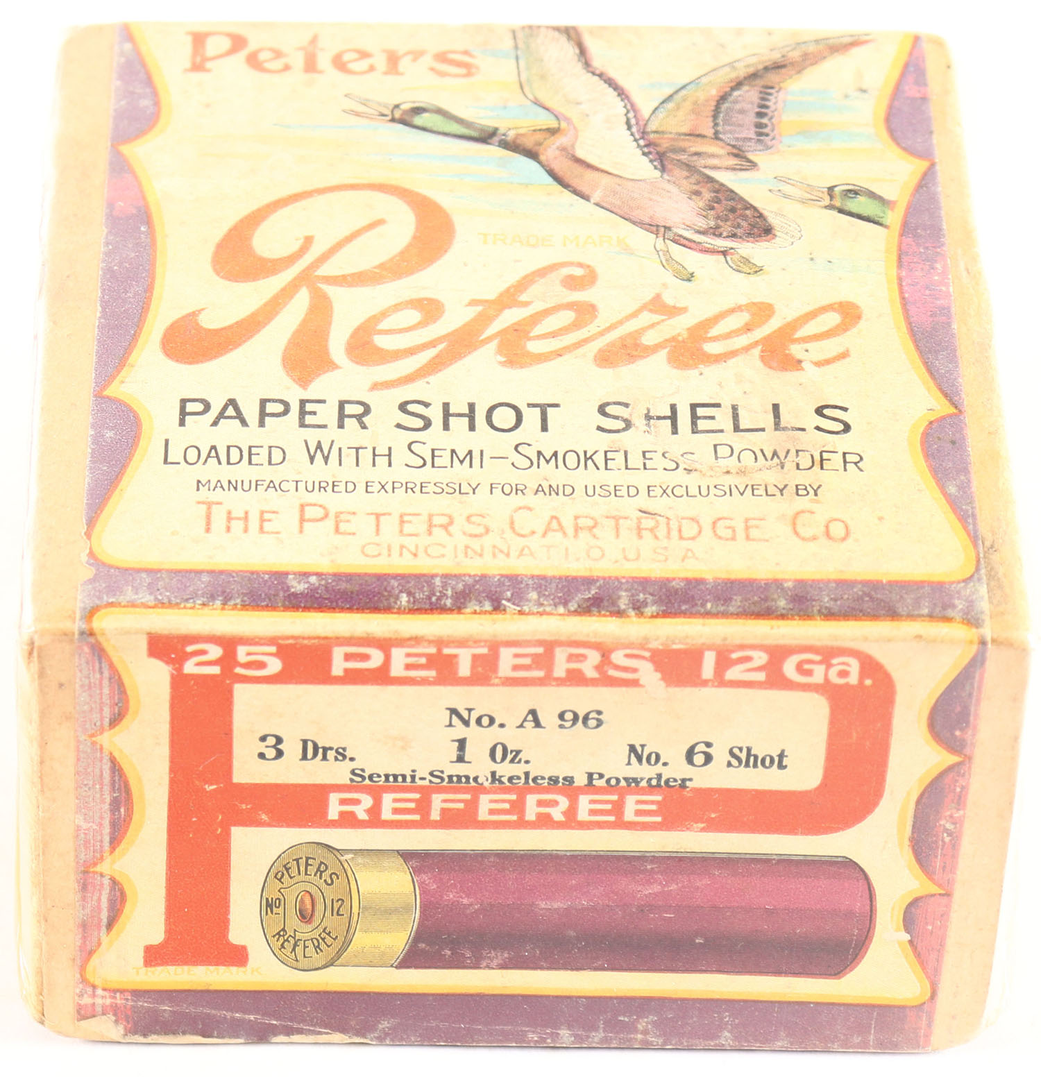 Peters Cart. Co., Referee, 12ga., 2pc., Empty, Shot size 6, No. A96, 3 Drs., 1 Oz., No. 6 Shot, buff box with multi-colored label with flying ducks, box is solid with great color to label, box has scuffing & soiling. Grade: Very Good + - Value: 150 to 400