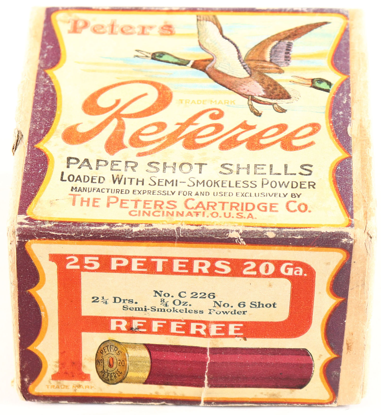 Peters Cart. Co., Referee, 20ga., 2pc., Empty, Shot size 6, No. C 226, 2 1/4 Drs., 8/4 Oz., No. 6 Shot, buff box with multi-colored label with flying ducks, box is solid with great color to label, box has scuffing & age soiling. Grade: Very Good ++ - Value: 250 to 500