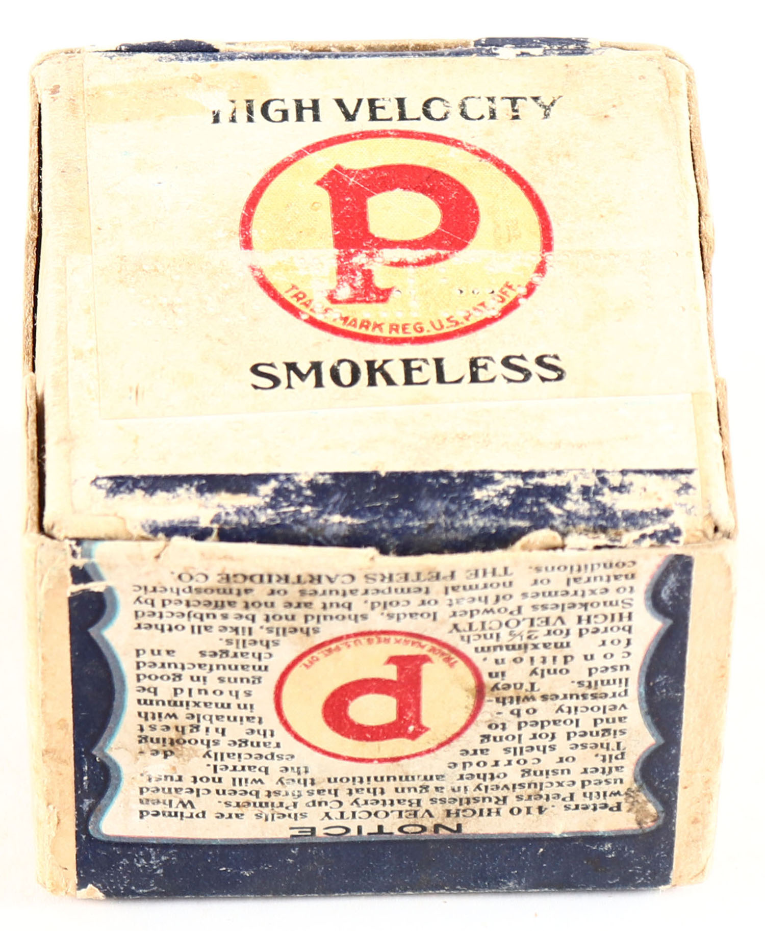 Peters Cart. Co., Blue Wing Teal, 410 Ga., 2 1/2'', 2pc., Empty, shot size 6CH, buff box with multi colored label that pictures Blue Wing Teal in flight, box has age soiling with light scuffing. Grade: Very Good ++ - Value: 200 to 500