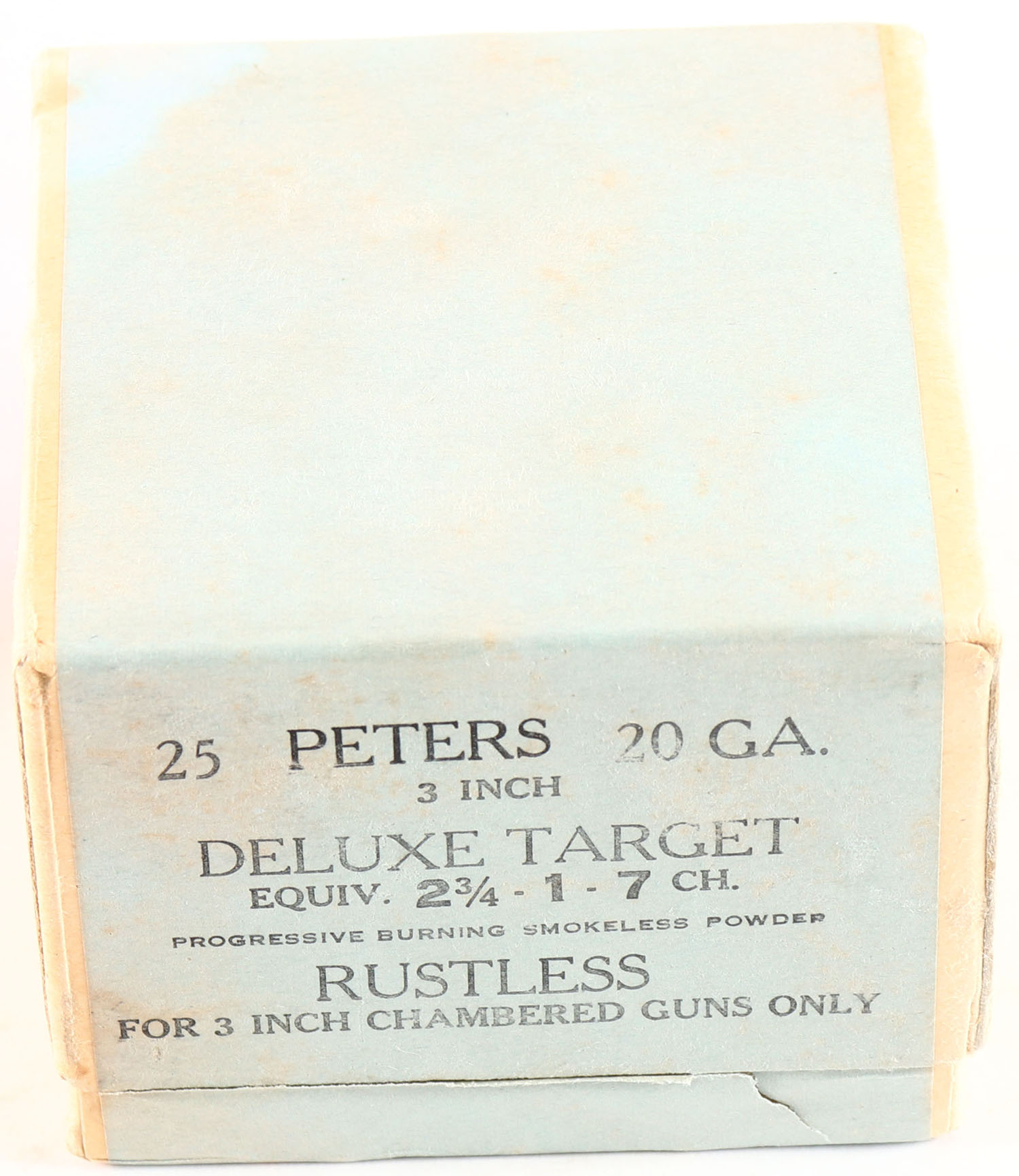 Peters Cart. Co., Deluxe Target, 20ga, 2pc., 3'', FULL & SEALED, shot size 7 CH., buff box with blue label, Loading: 2 3/4, 1 Oz. No. 7 Ch shot, Progressive Burning Smokeless Powder, box is very solid. Grade: Excellent ++ - Value: 100 to 300
