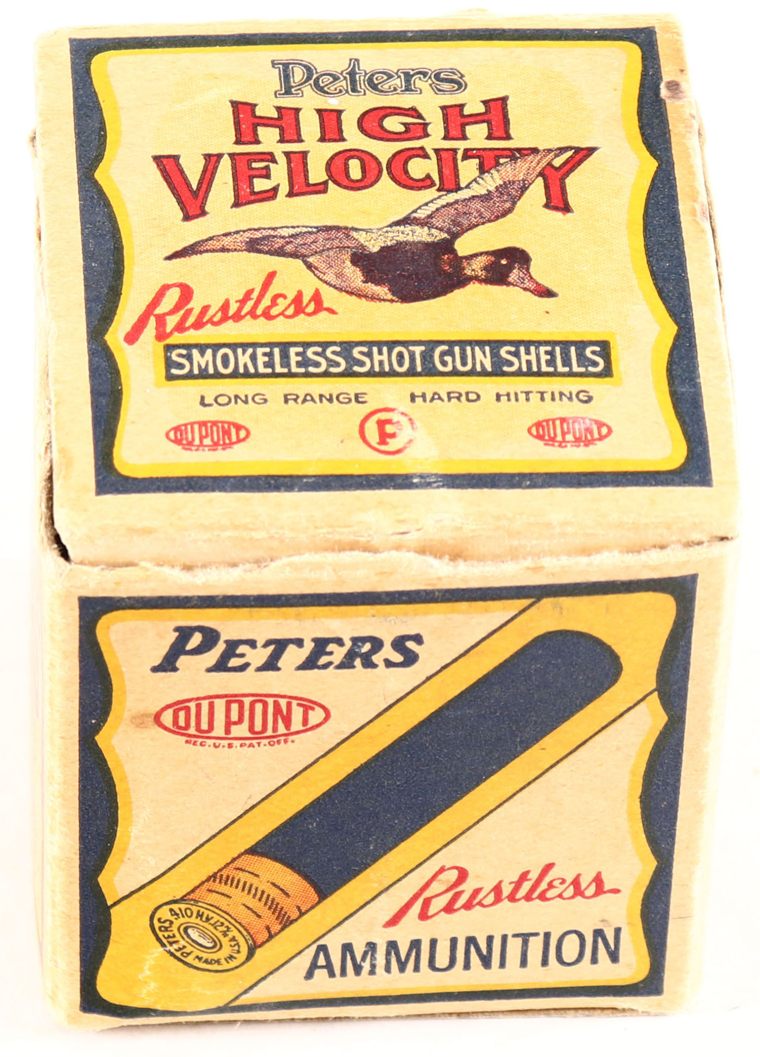 Peters Cart., High Velocity, 410ga., 2 1/2'', 1pc., Full, shot size 5CH & 7 Rds. Of shot size 4CH, multi colored box that pictures mallard flying out of the marsh grass, No Duvrock sides, box has torn top flap, shells are excellent. Grade: Very Good ++ - Value: 300 to 800