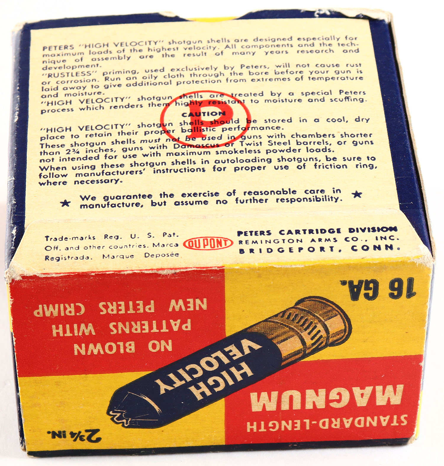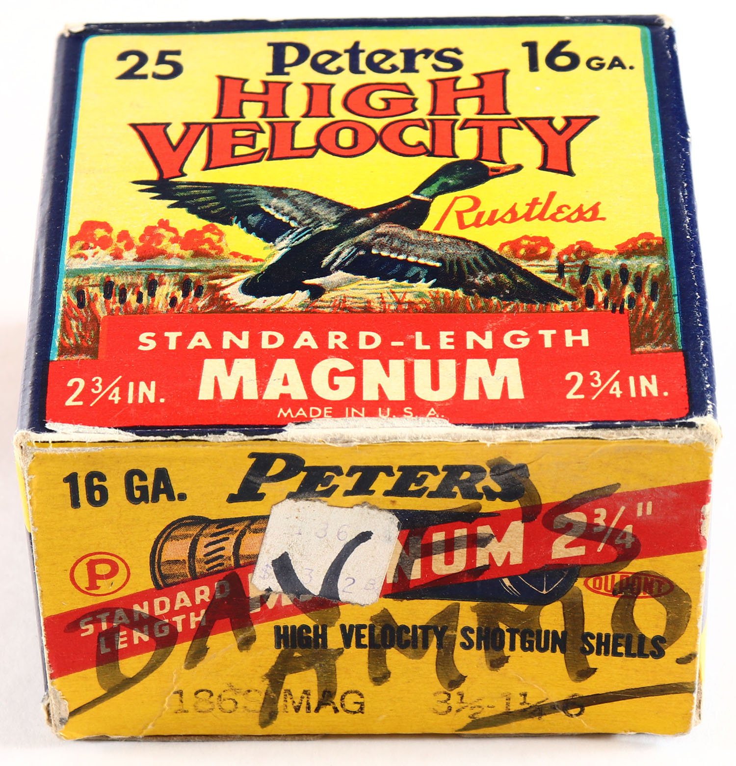 Peters Cart. Co., Magnum, High Velocity, New Peters Crimp, 16ga., 1pc., Partial 16 Rds., shot size 6 Magnum, multi colored box that pictures mallard flying out of the marsh grass, box is nice with great colors has writing on bottom flap, Shells are excellent. Grade: Very Good ++ - Value: 30 to 60