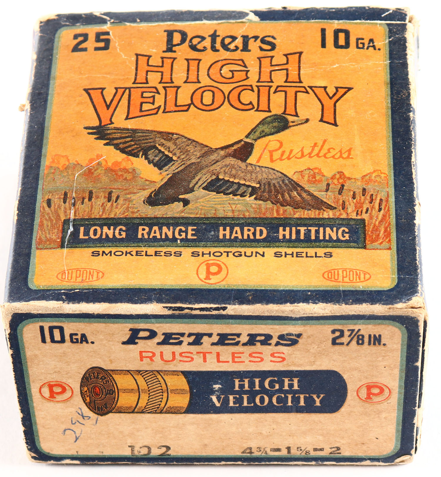 Peters Cart. Co., Bridgeport, CT, High Velocity, 10ga., 1pc., Full, shot size 2, multi colored box that pictures mallard flying out of the marsh grass, box has edge wear with scuffing and light age soiling but good color, shells are good. Grade: Very Good + - Value: 40 to 100
