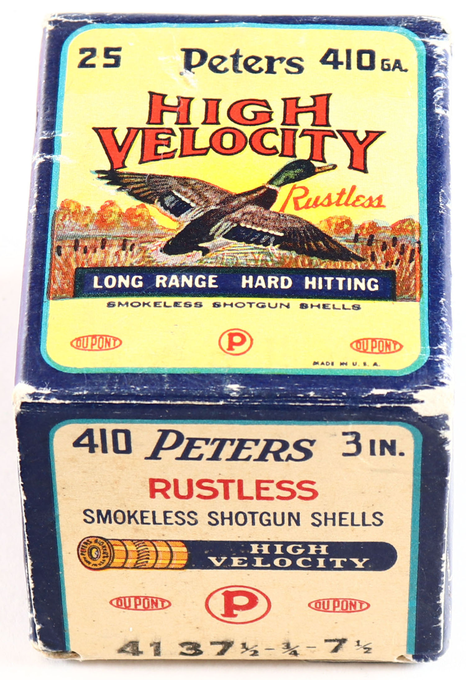 Peters, High Velocity, 410ga., 3'', 1pc., Full, shot size 7 1/2, multi-colored box with mallard duck flying out of marsh grass, box has great colors with light edge wear & light soiling, Shells are excellent. Grade: Excellent + - Value: 40 to 100