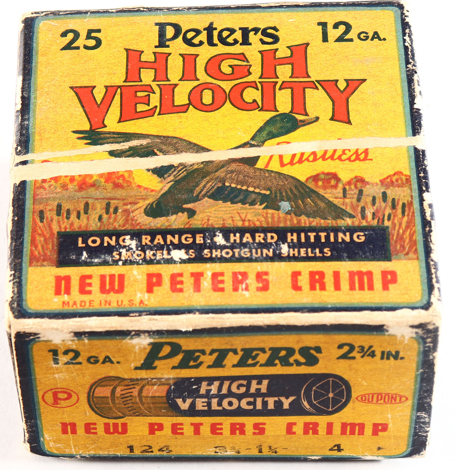 Peters Cart. Co., Bridgeport, CT, High Velocity, 12ga., 2 3/4'', 1pc., Partial 24 rds., shot size 4, multi colored box that pictures mallard flying out of the marsh grass, box is very solid with great colors, box has age soiling & light edge wear, shells are excellent. Grade: Very Good ++ - Value: 20 to 100