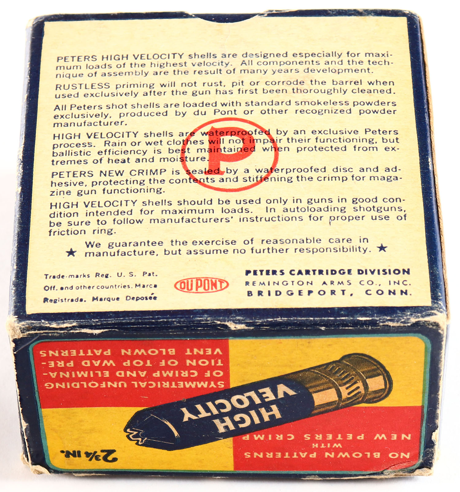 Peters Cart. Co., High Velocity, New Peters Crimp, 12ga., 1pc., Full, shot size 6, multi colored box that pictures mallard flying out of the marsh grass, box is solid with edge wear & light age soiling, Shells are very good. Grade: Very Good ++ - Value: 20 to 80