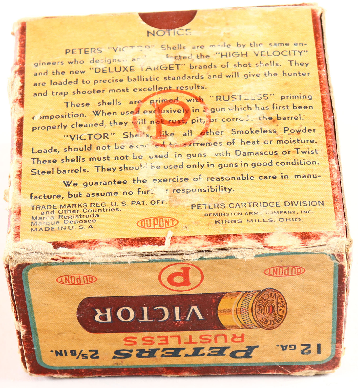 Peters, Victor, Rustless, 12ga, 1pc., Full, shot size 4, Maroon, cream & orange box, 2 5/8'', box is solid, box has age soiling with edgewear, shells are very good. Grade: Very Good - Value: 20 to 50