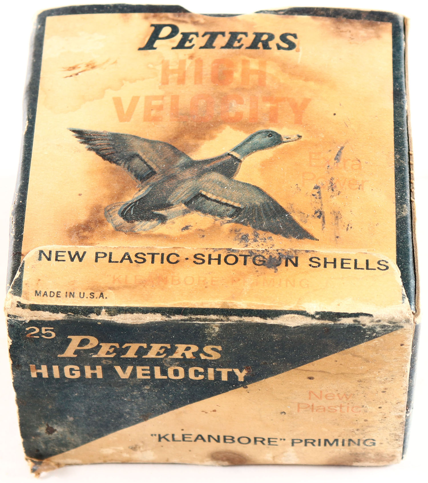 Peters Cart. Co., High Velocity, 20ga, 2 3/4'', 1pc., Full, shot size 6, multi colored box that pictures mallard flying, box has soiling, shells are good. Grade: Good - Value: 10 to 20