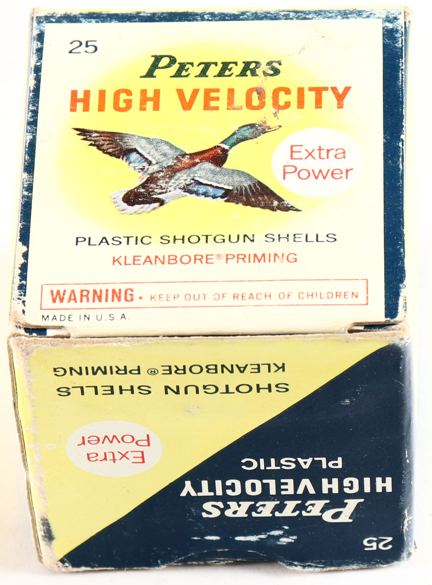 Peters Cart. Co., High Velocity, 410ga, 3'', 1pc., Full, shot size 7 1/2, multi colored box that pictures mallard flying, box is solid with edge wear, scuffing, soiling & very nice color, shells are very good. Grade: Very Good + - Value: 10 to 30