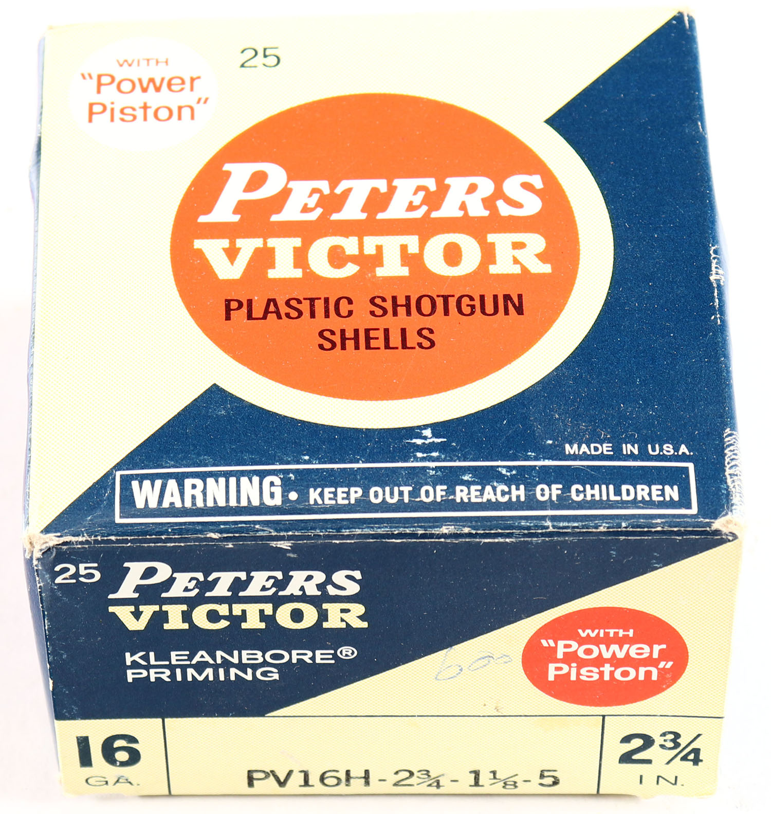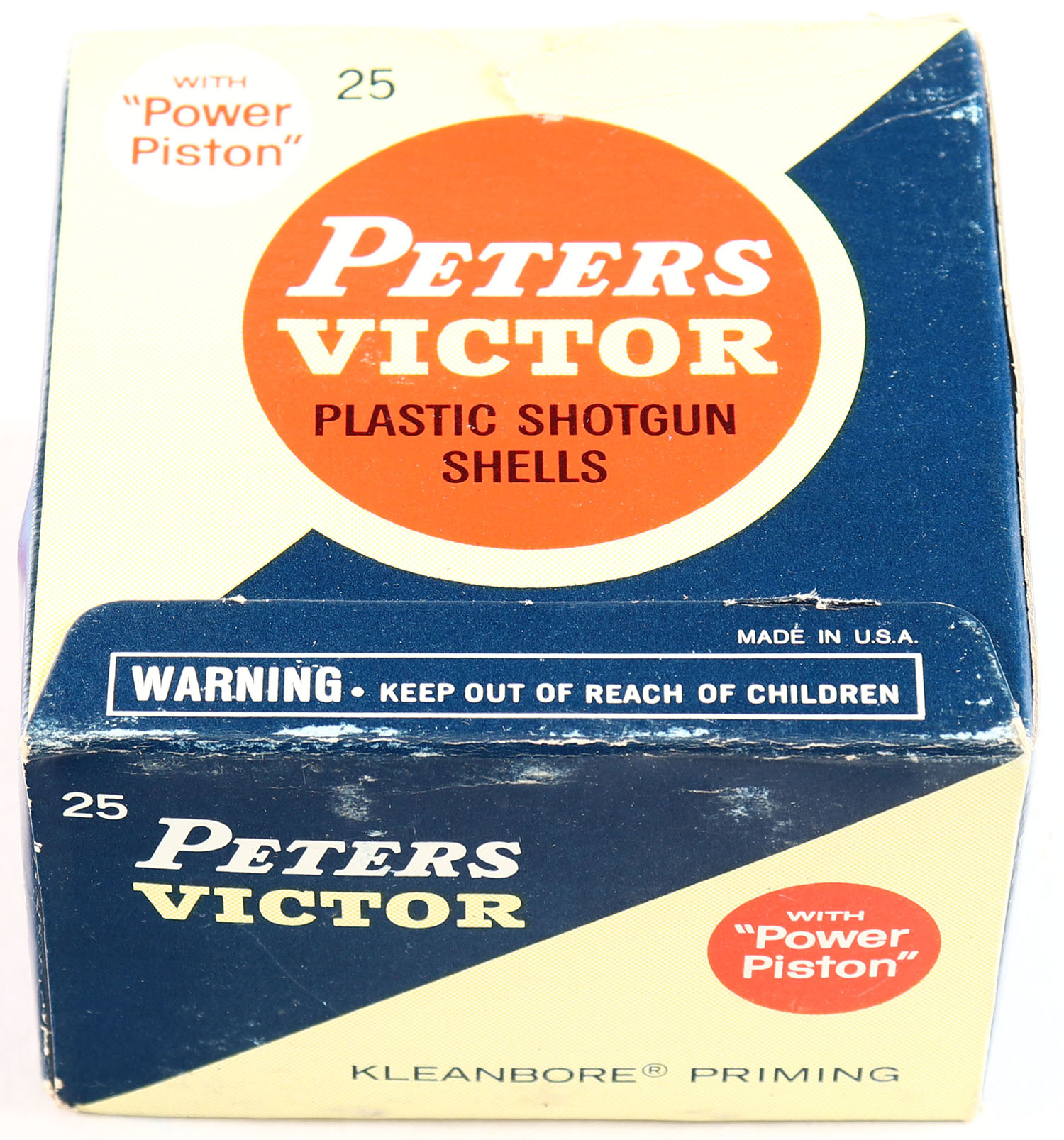 Peters, VICTOR, 12ga., 1pc., Full, shot size 5, orange, blue & tan box, box is solid with very nice colors, shells are excellent. Grade: Very Good ++ - Value: 10 to 30
