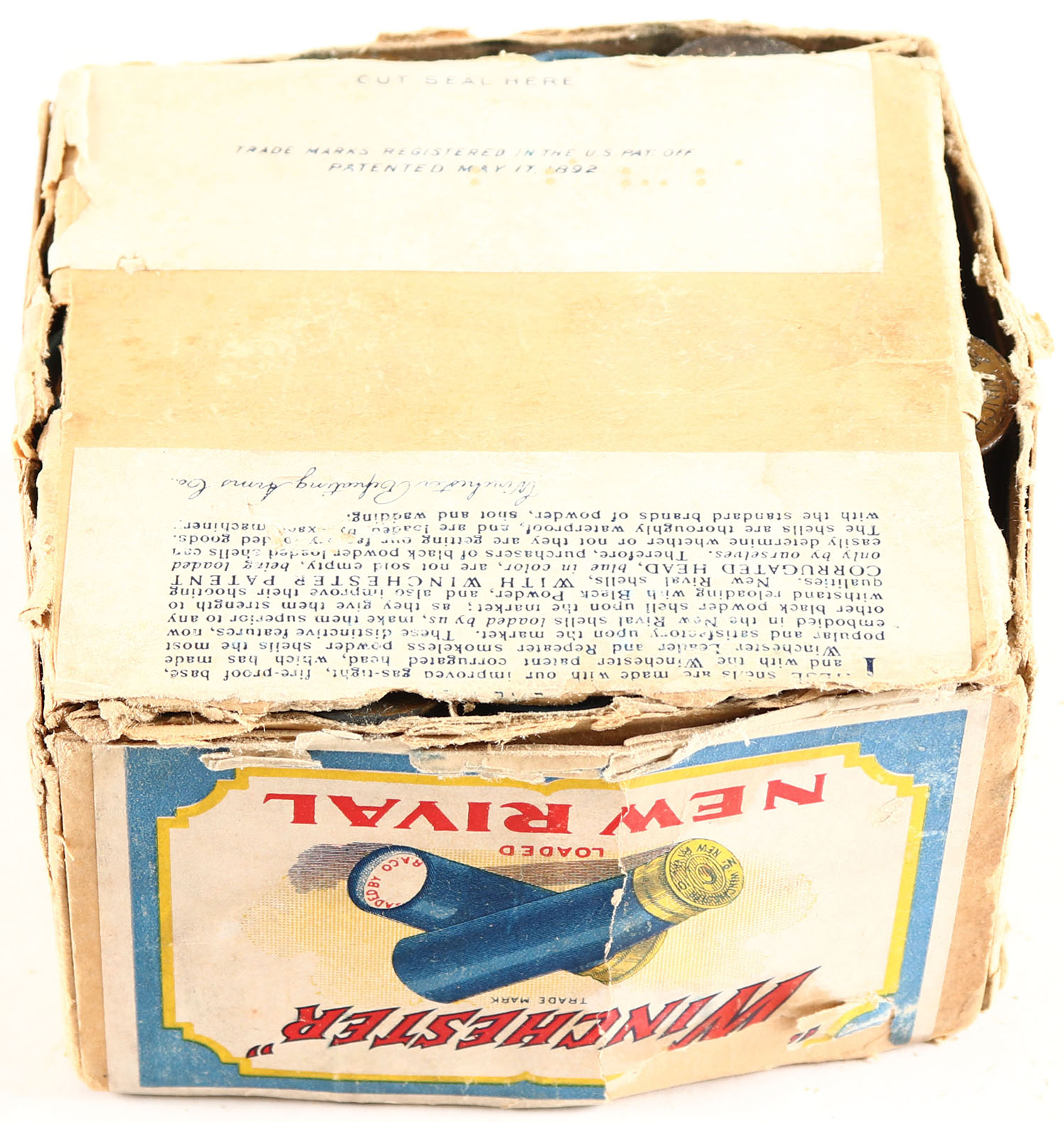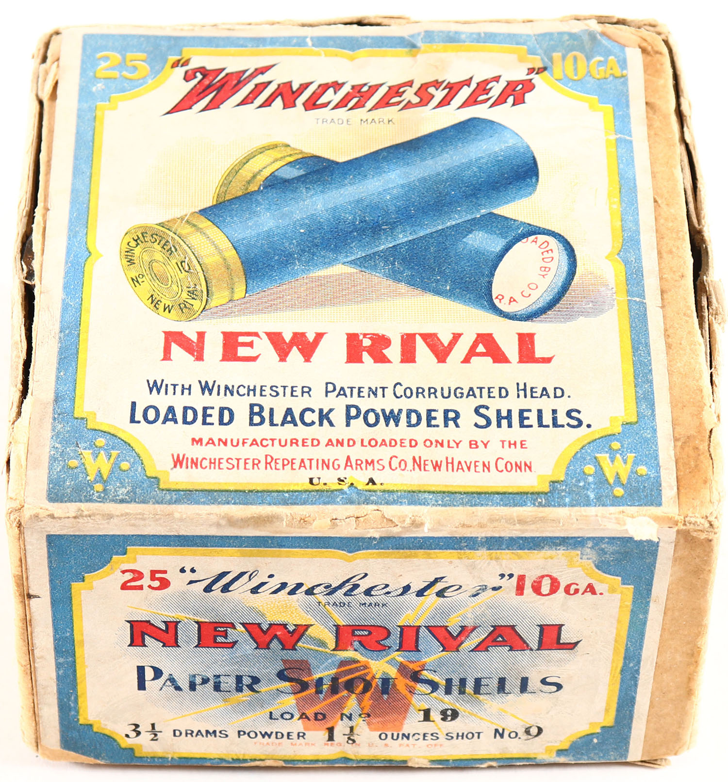 Winchester, NEW RIVAL, 10 GAUGE, 2pc., FULL, buff box with multi-colored label that pictures the two crossed shells, loaded BLACK POWDER shells, 3 1/2 Drams 1 1/8 Ounces Shot No. 9, box has seam splits and age soiling , Shells are excellent. Grade: Very Good ++ - Value: 100 to 500