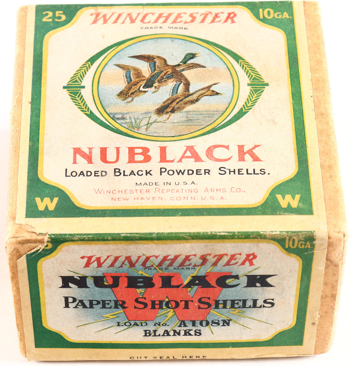 Winchester, NUBLACK, 10ga, 2pc., FULL & SEALED, Load No. A108N, buff box with multi-colored label that pictures three mallards flying over water, Yellow shells on one side panel, Black Powder, Box is very solid with very good colors. Grade: Excellent - Value: 200 to 500