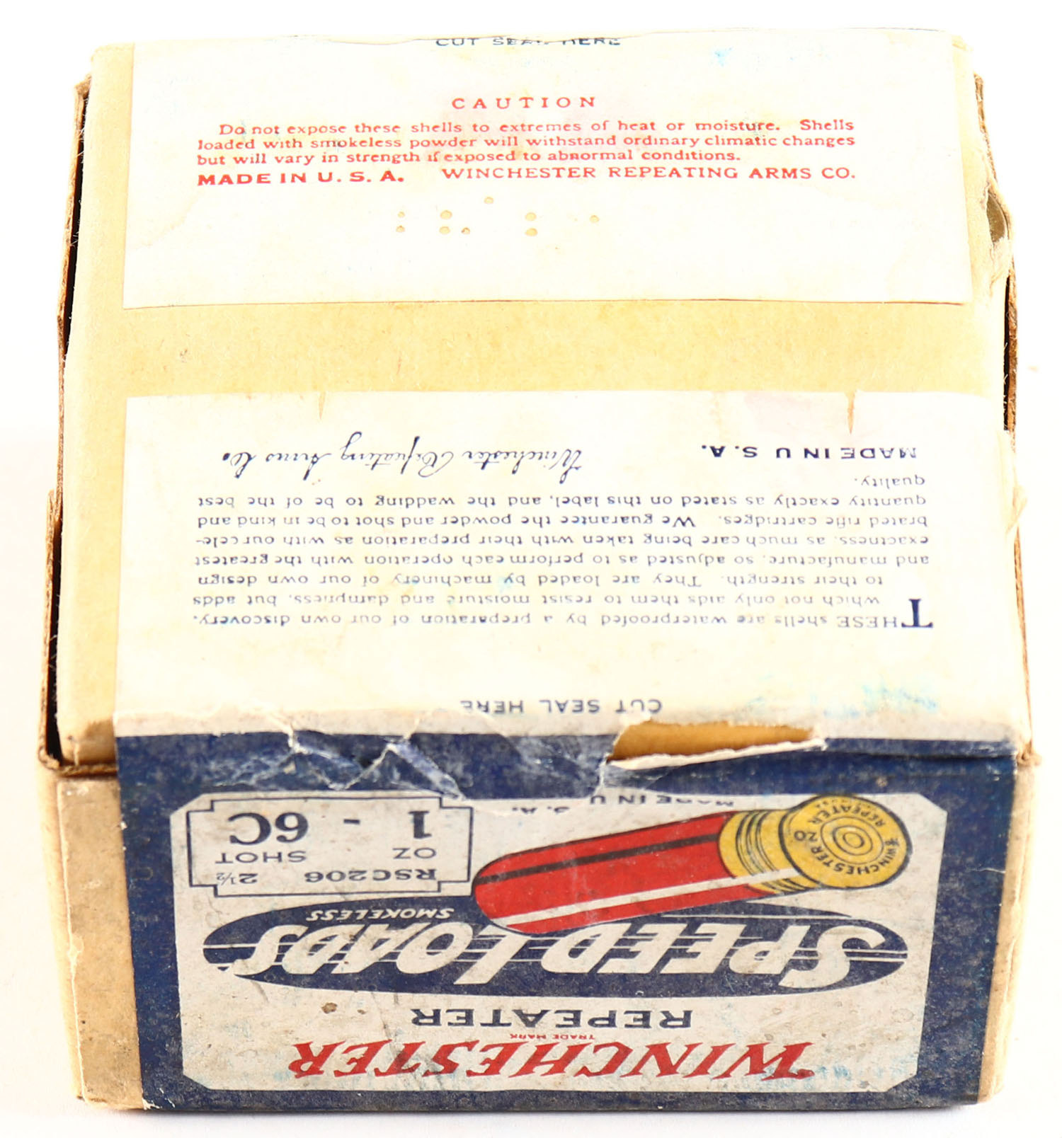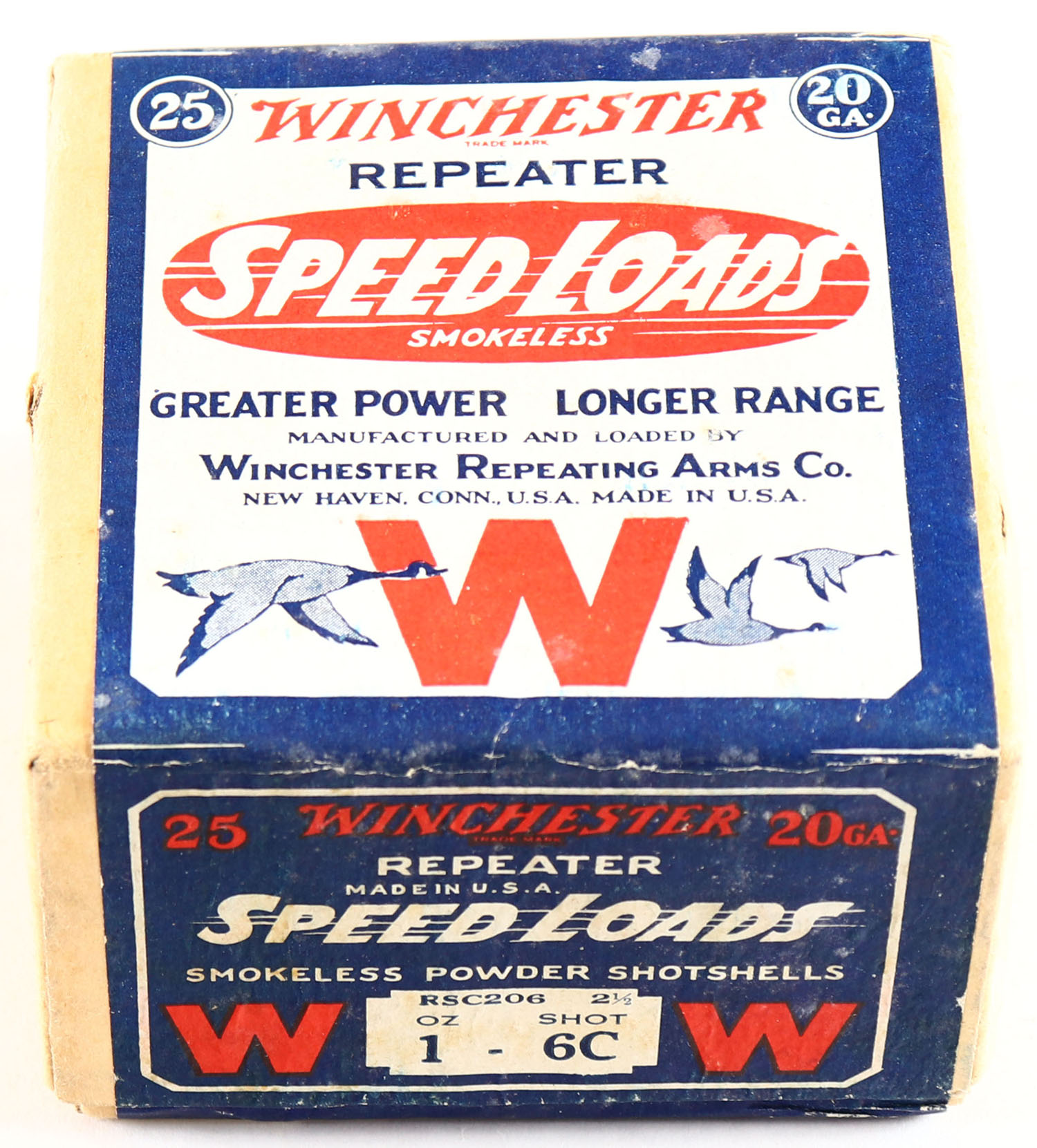Winchester REPEATER Speed Loads, 20 Gauge, 2pc., FULL & SEALED, shot size 6C, buff box with dark blue red & white paper label, Box is very solid with great colors to label, RARE with the REPEATER markings. Grade: Excellent + - Value: 200 to 600