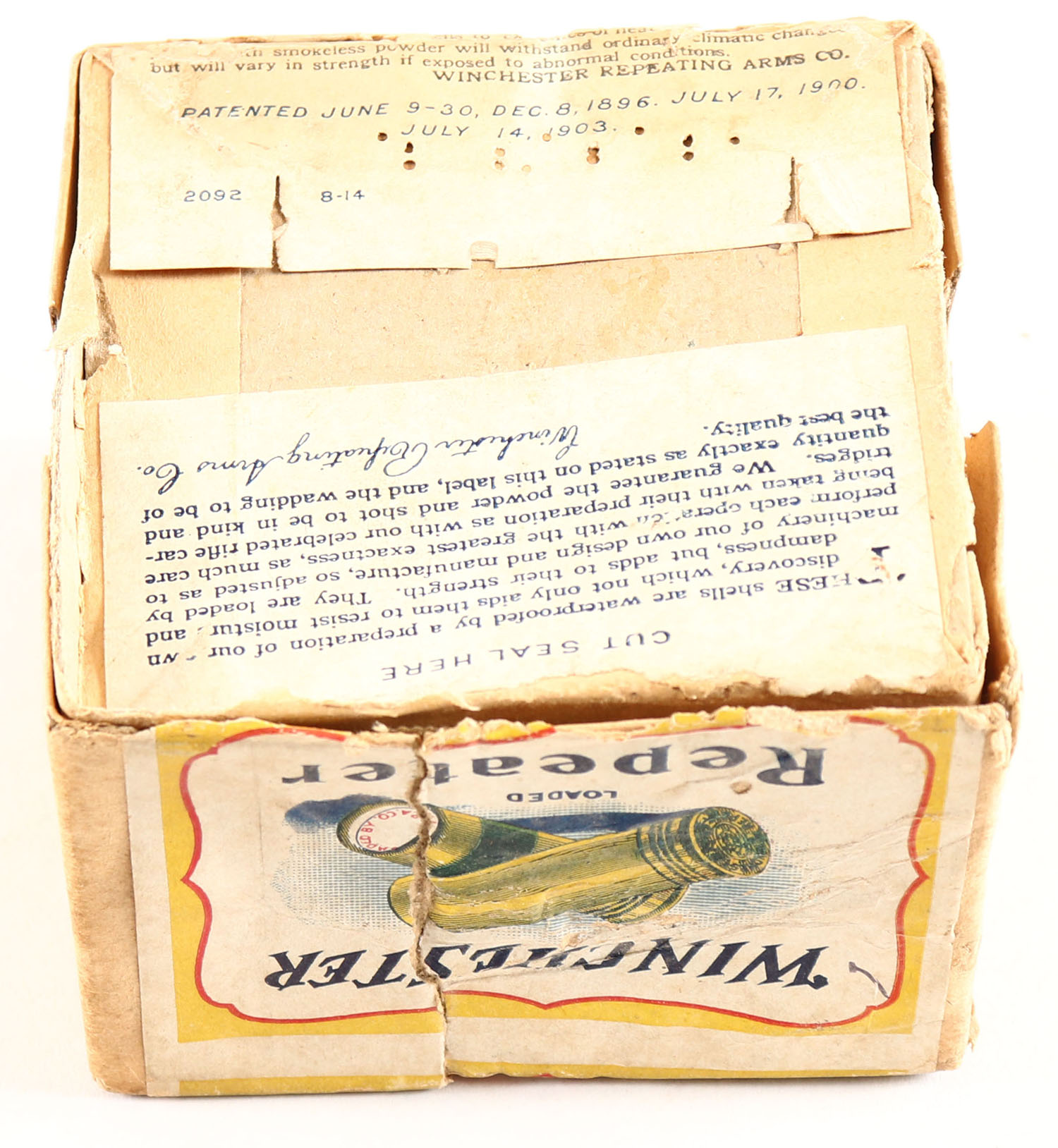 RARE Winchester, REPEATER, 28 Gauge, 2pc., Empty, Shot Size 4, Buff box with yellow, white & red label showing lightning bolt, box is solid with nice label, box has seam split with age soiling. Grade: Very Good - Value: 100 to 400