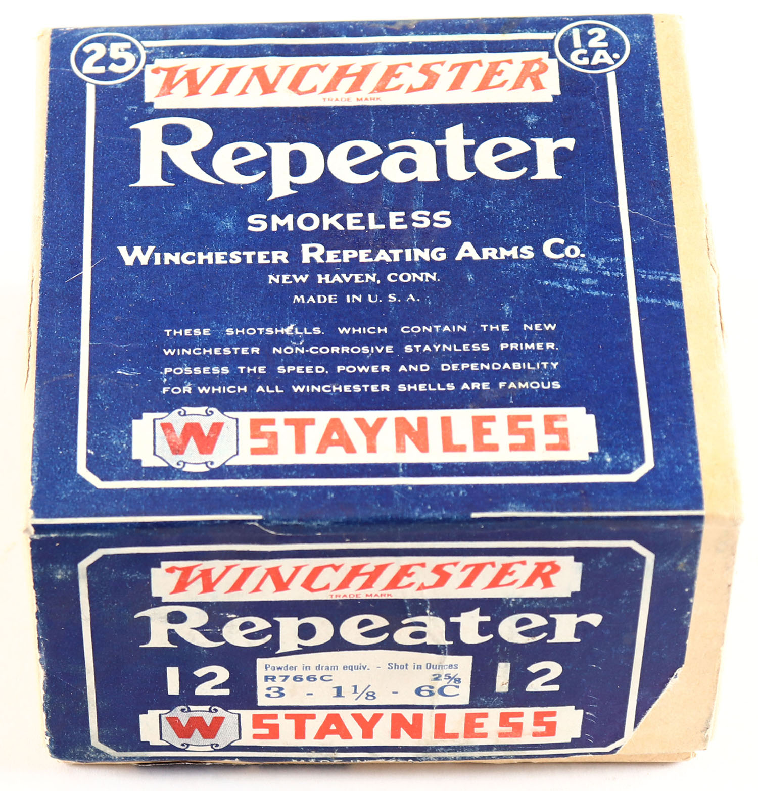 Winchester, Repeater, STAYNLESS, 12ga., 2pc., Empty., shot size 6C, buff box with blue, red & white label, box is very solid. Grade: Excellent ++ - Value: 20 to 80