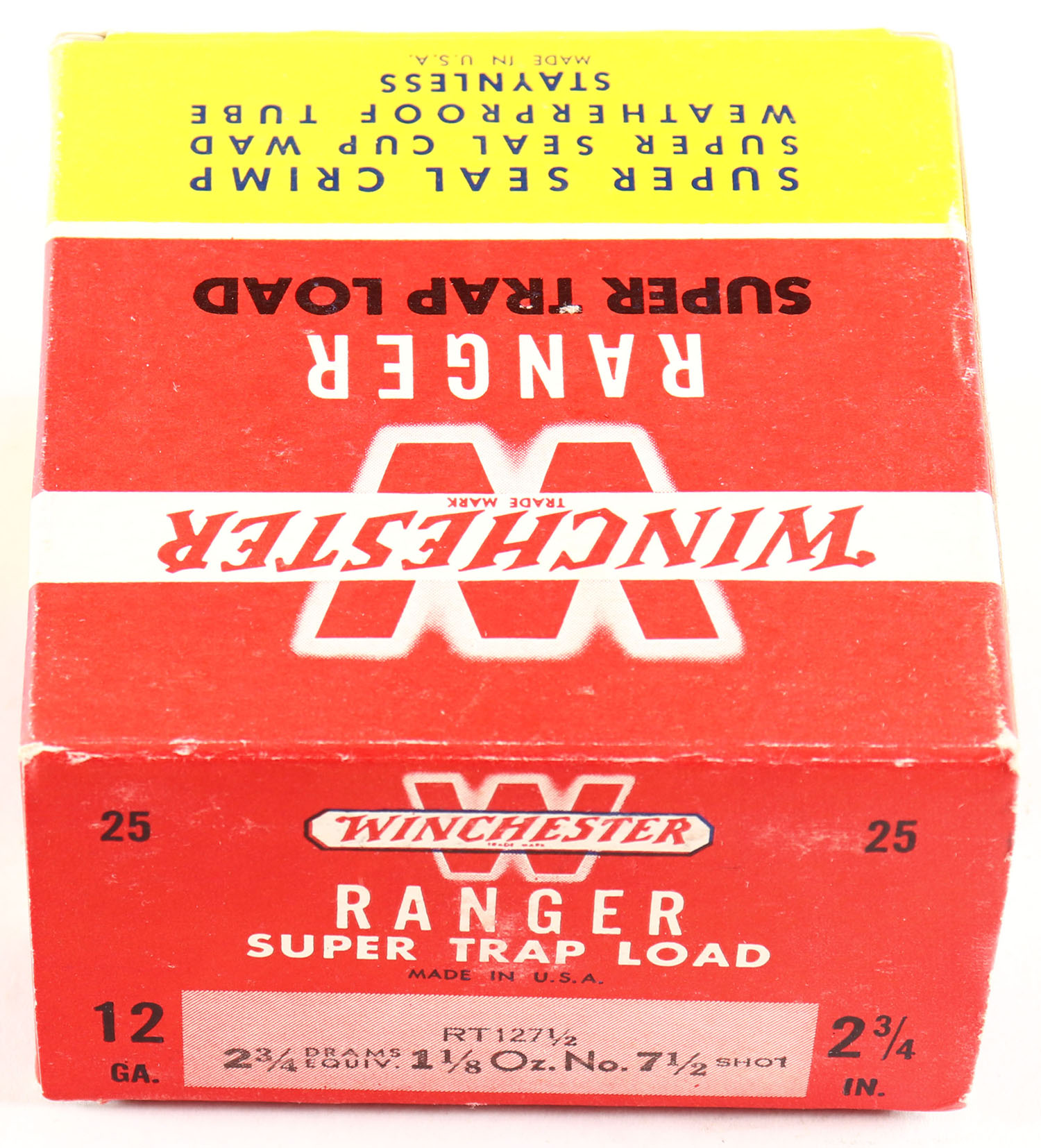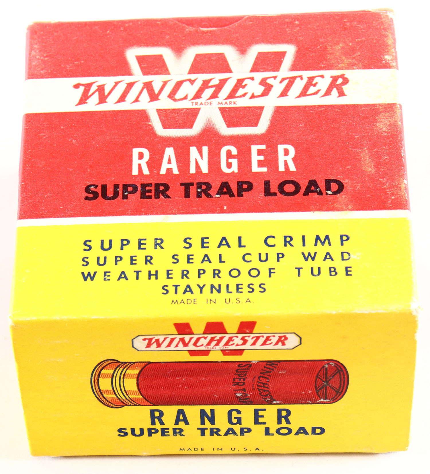 Winchester, Ranger Super Trap Load, 12ga., 1pc., Full, shot size 7 1/2, red, white & yellow box, Box is very solid with very nice colors, shells are excellent. Grade: Excellent ++ - Value: 10 to 30