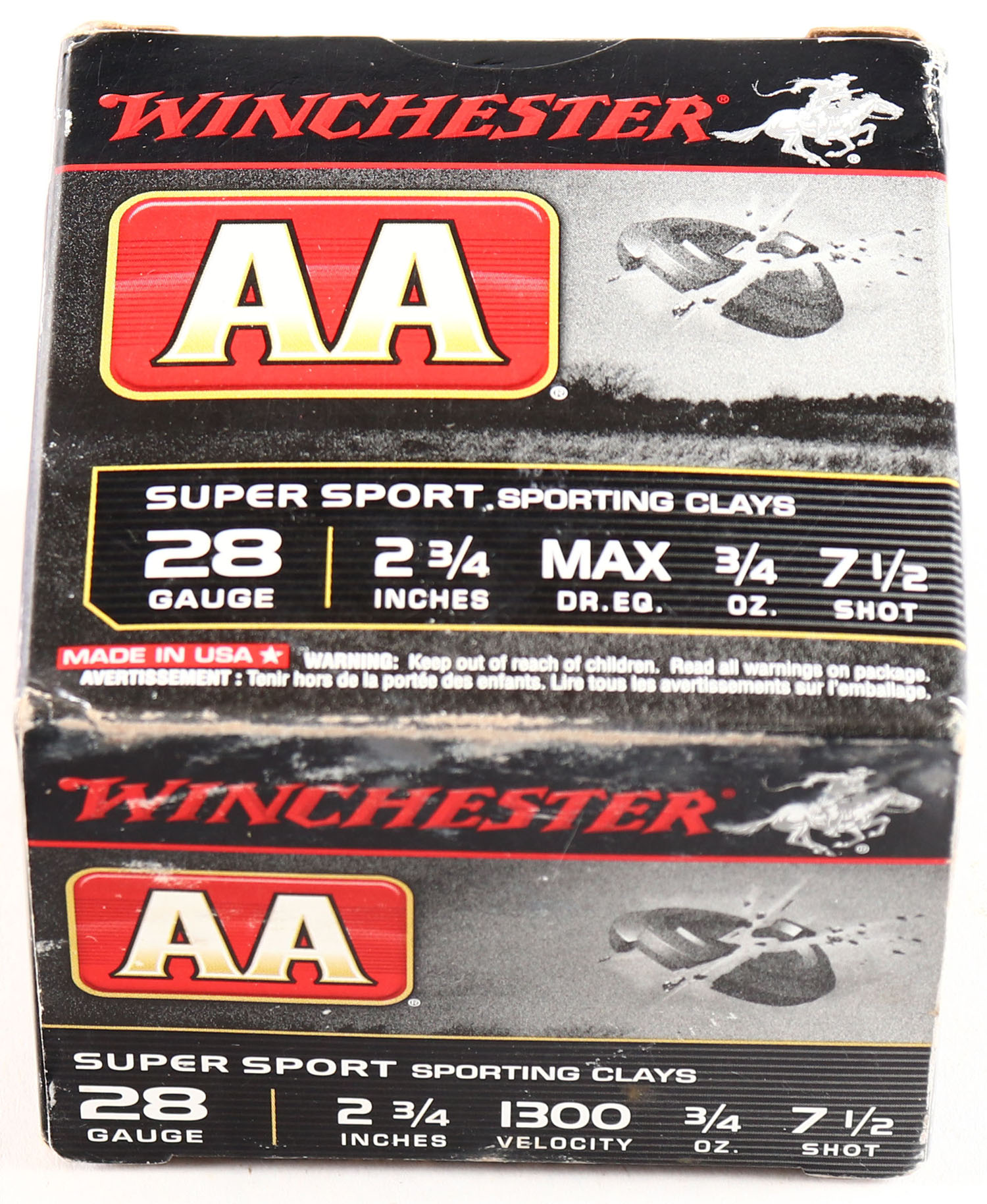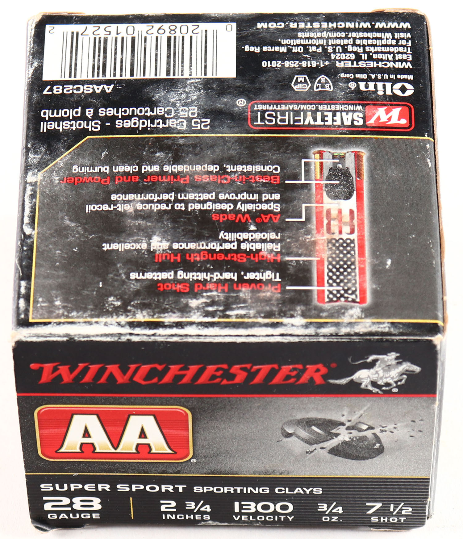Winchester, AA, Target Load, 28ga., 2 3/4'', 1pc., Full, shot size 7 1/2, multi-colored box, box is very solid with great colors, shells are excellent. Grade: Excellent - Value: 10 to 30